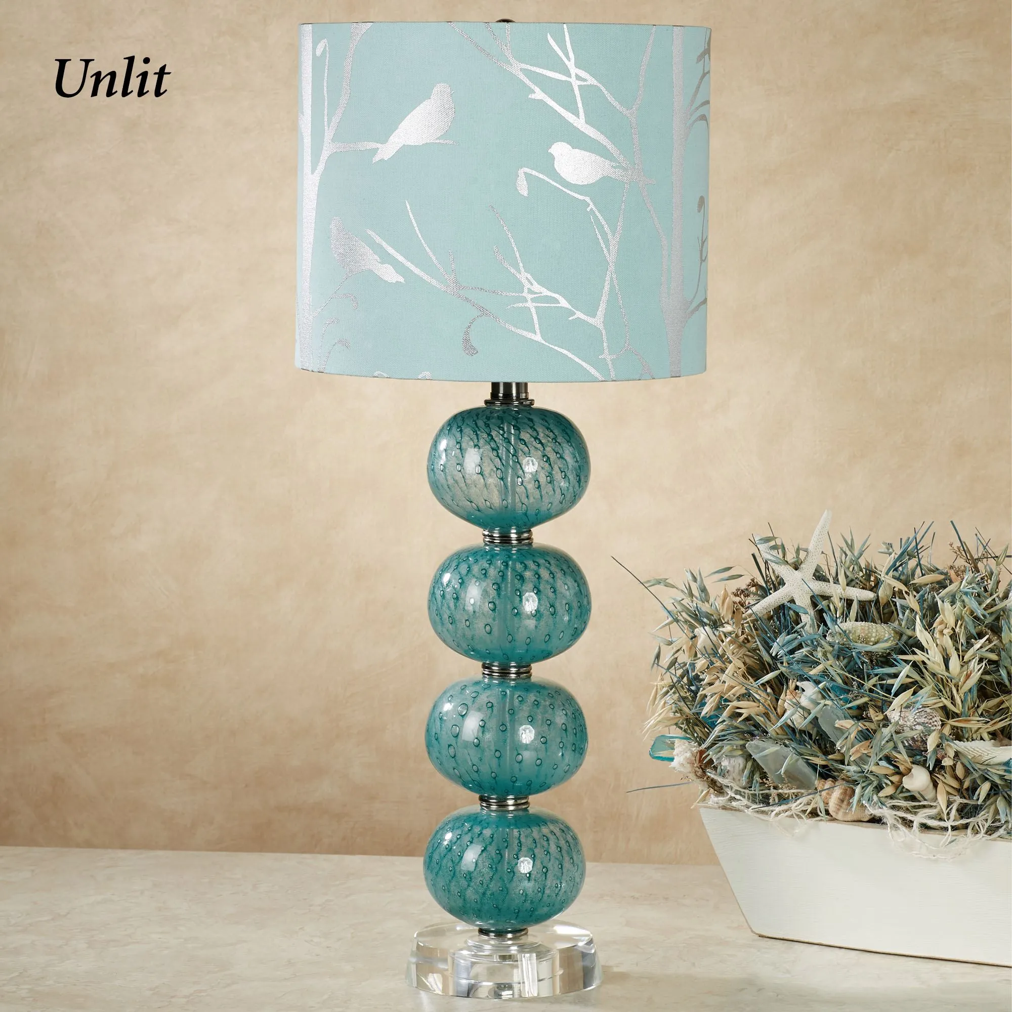 The Baccus Table Lamp illuminates uniquely beautiful design at every angle. Mounted on a clear circular glass base, the eye-catching font rises with silver metal spacers and handblown bubble glass in speckled teal hues. Silhouetted with silver birds and tree branches, the light teal linen shade tops the look underneath the 1.75"H raised acrylic ball finial. UL listed. Requires one 60W max. bulb. Measures 11"dia.x26"H. Due to the handcrafted nature, slight variations may occur.