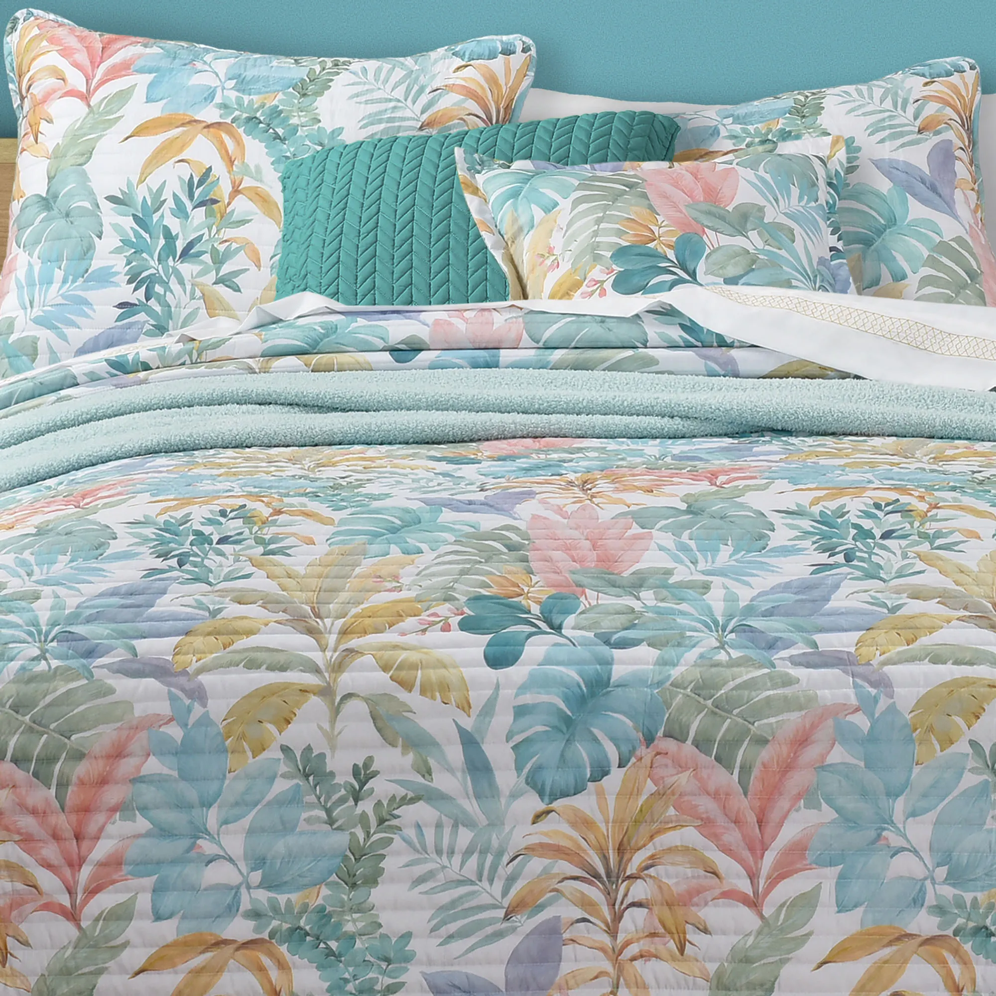 • Tropical bedding features pastel palm leaves