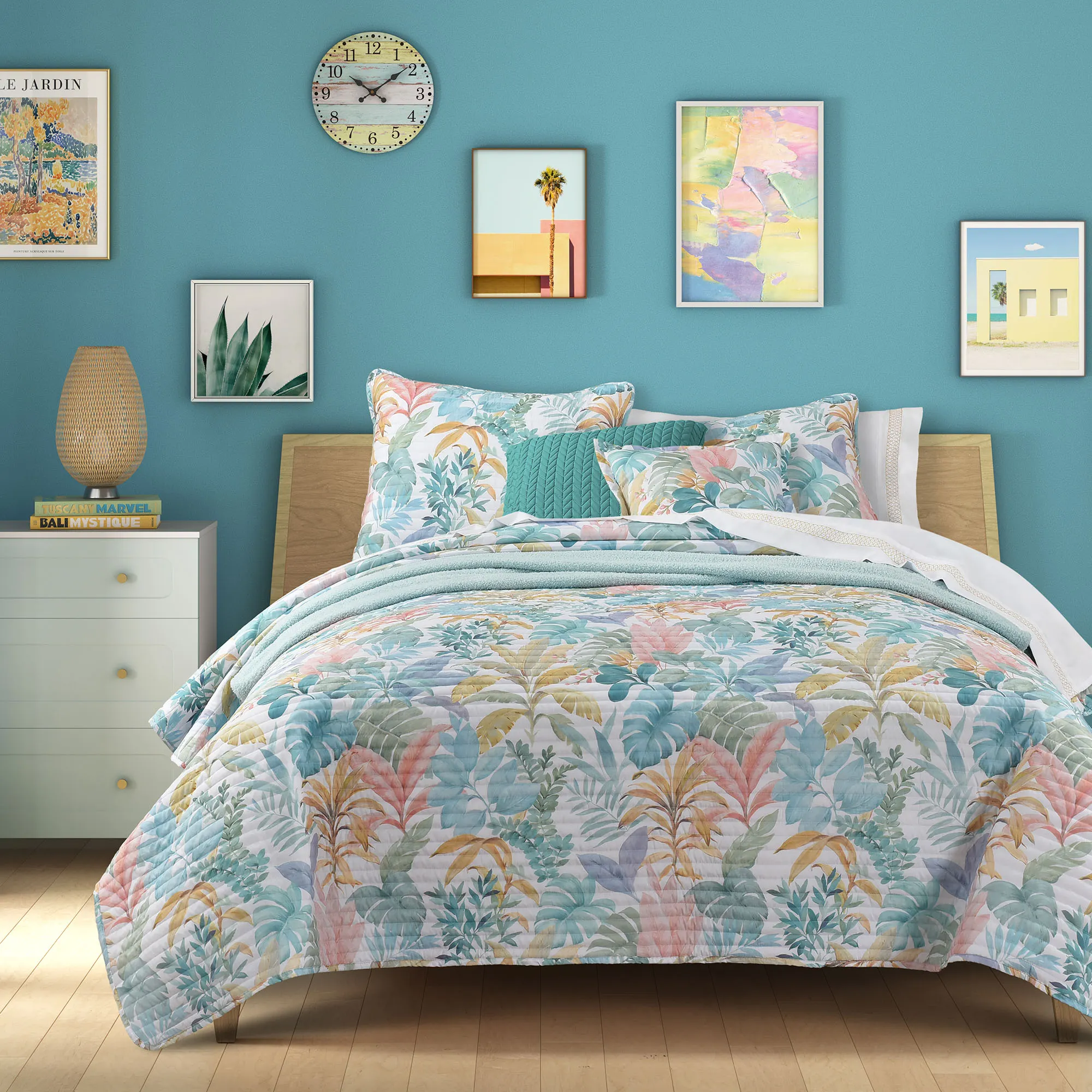 Bahama Aqua Pastel Tropical Palm Leaf Quilt Set Bedding by J Queen Bold