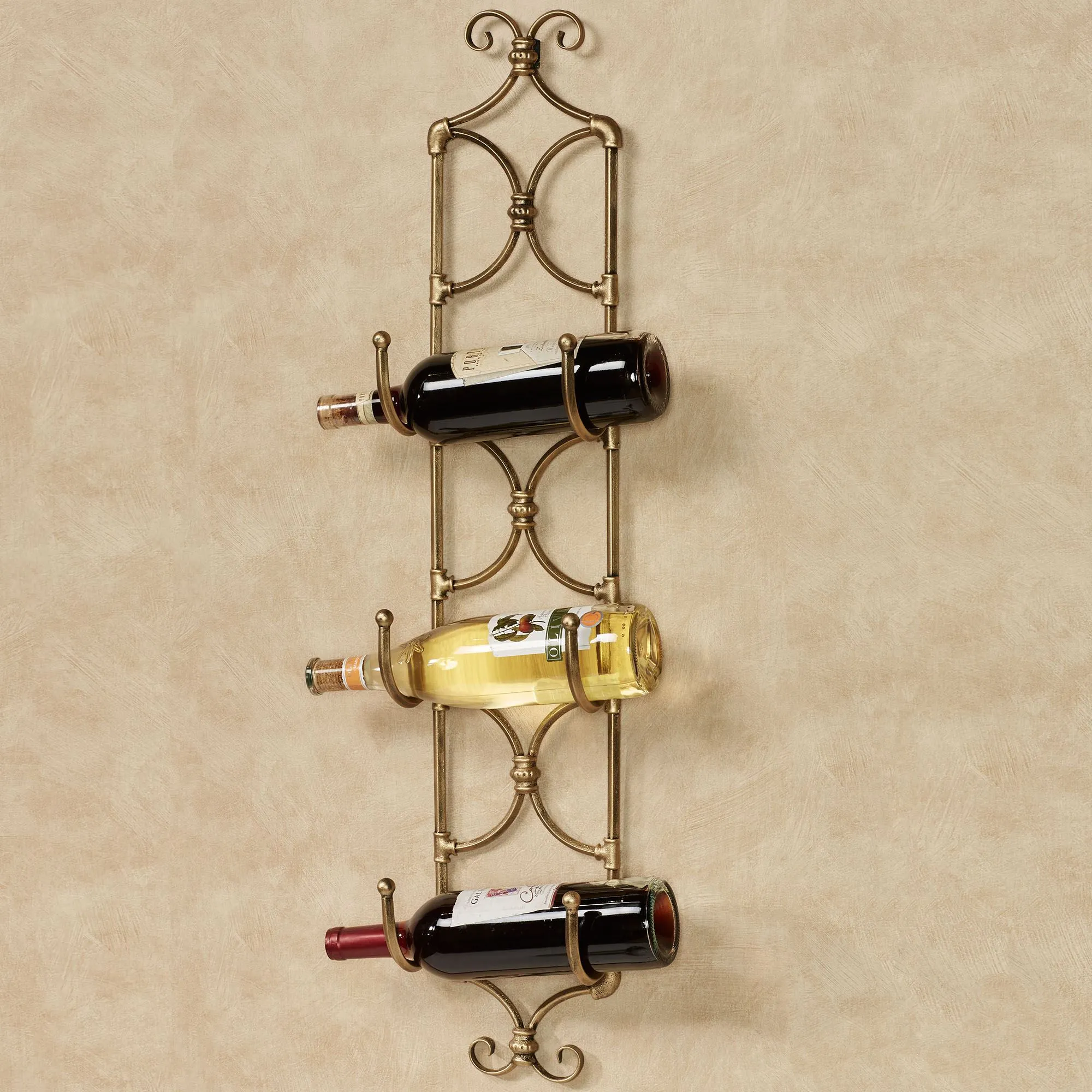 Elegantly store rolled towels in the Bain Wall Mount Rack. This sophisticated, openwork metal wall rack features swirling loops and scrolls in an antique gold finish. Wall rack may also hold up to three bottles of your favorite wine. Measures 7"Wx5"Dx35"H.