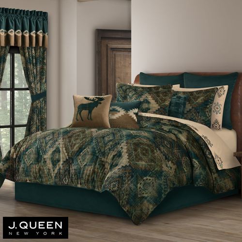 Decorate with the deep tones and bold Southwest spirit of the Baja Bedding from J. Queen New York. The oversized comforter features printed Southwestern medallions in teal, brown, dark amber, navy, warm celadon, and beige on a luxurious polyester velvet ground. Oversized comforter is backed in dark green polyester. Bedding fill is polyester. Dry clean only. Imported.