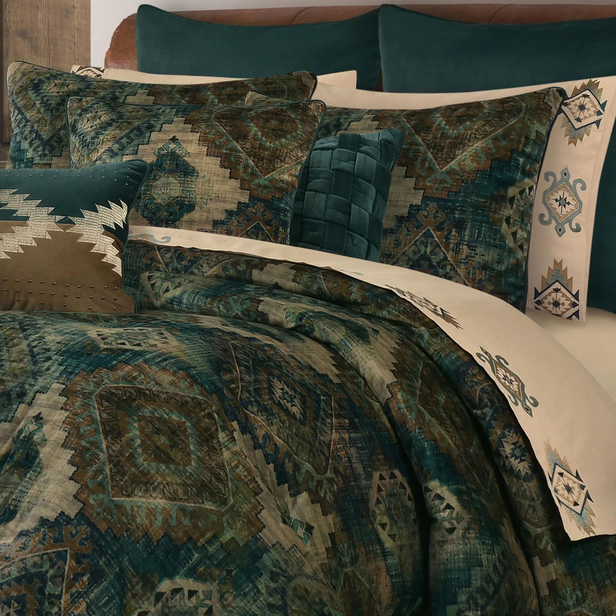 Washed in the shades of night, deep earthen tones color the Baja Bedding with a bold Southwest spirit. From J. Queen New York, the printed Southwestern medallions feature teal, brown, dark amber, navy, warm celadon, and beige on a luxurious polyester velvet ground. Solid dark teal and brown velvet elements, alongside beautiful Southwestern embroidery, style the ensemble with further panache.