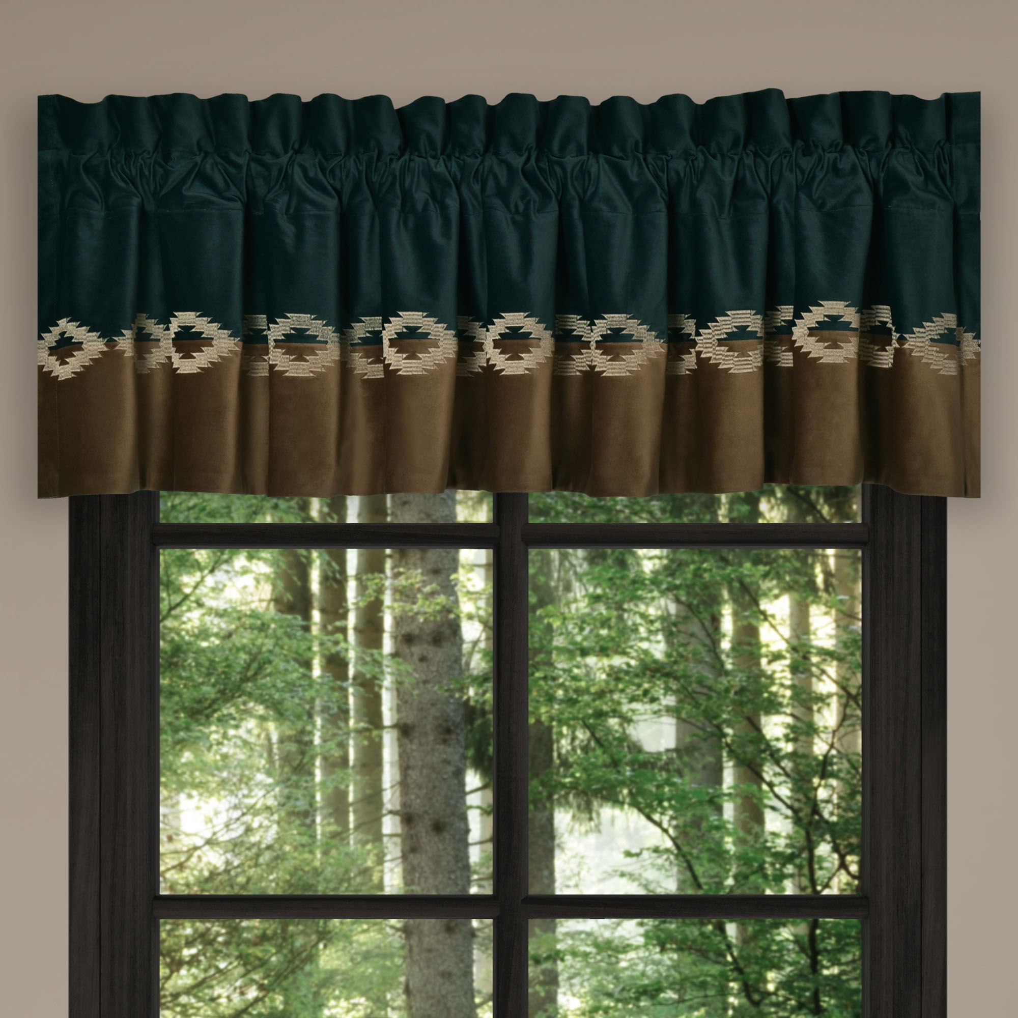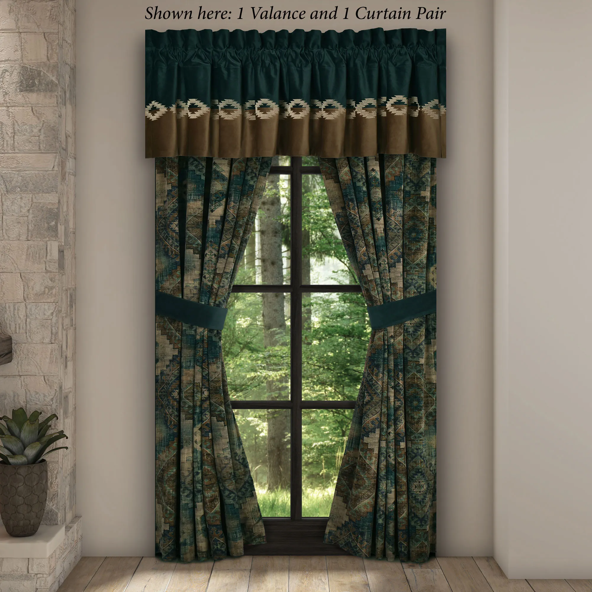 Lined Window Treatments have tailored edges and 3" rod pockets. Wide Curtain Pair has printed medallions. Tiebacks are included. Curtains are available in two lengths. Valance has a dark teal velvet top pieced with a brown velvet bottom and embellished with embroidered Southwest designs.
