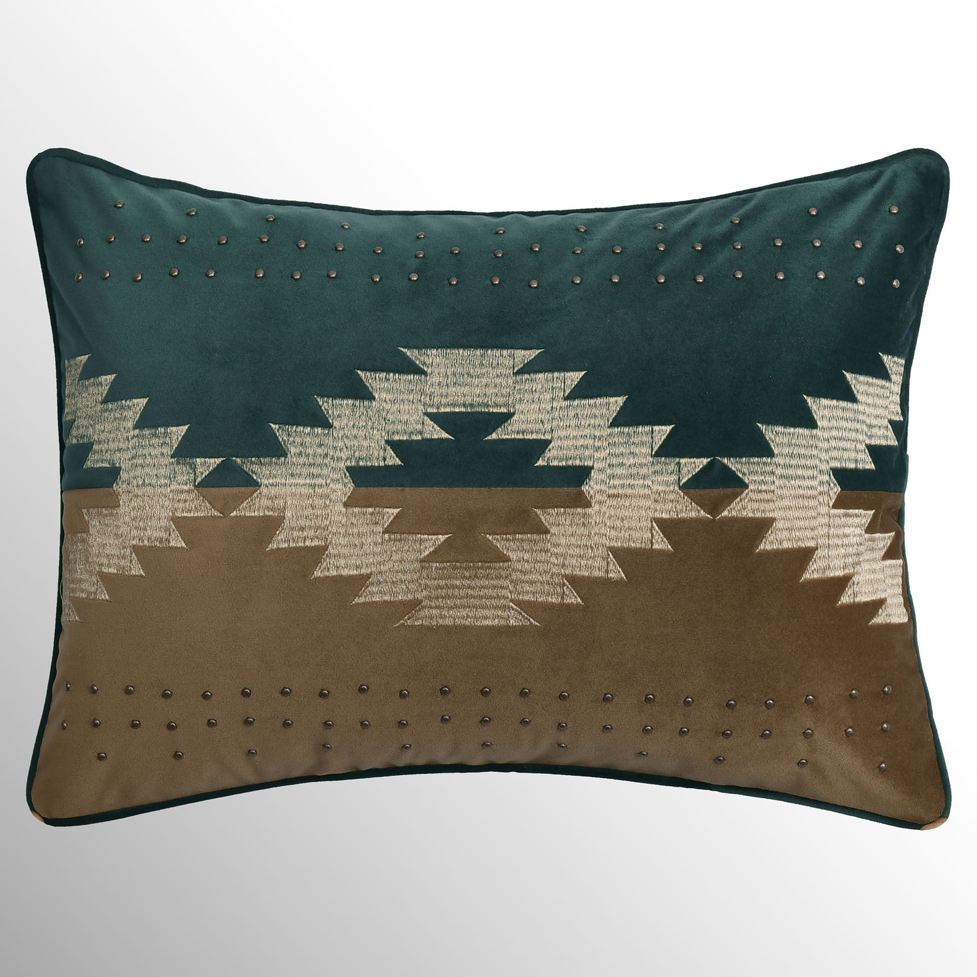 Pillows are reversible. Spot clean. Tailored 17" Square has dark teal velvet in a basket weave design; reverses to solid dark teal velvet; zipper closure. Embroidered 18" Square is brown velvet with an embroidered plaid applique moose and piped edges; reverses to plaid. Piped 20" Square has medallions and reverses to plaid. Pieced Rectangle has a dark teal velvet top, brown velvet bottom, embroidered medallions, and oil-rubbed bronze metal nailhead trim accents; reverses to dark teal velvet.