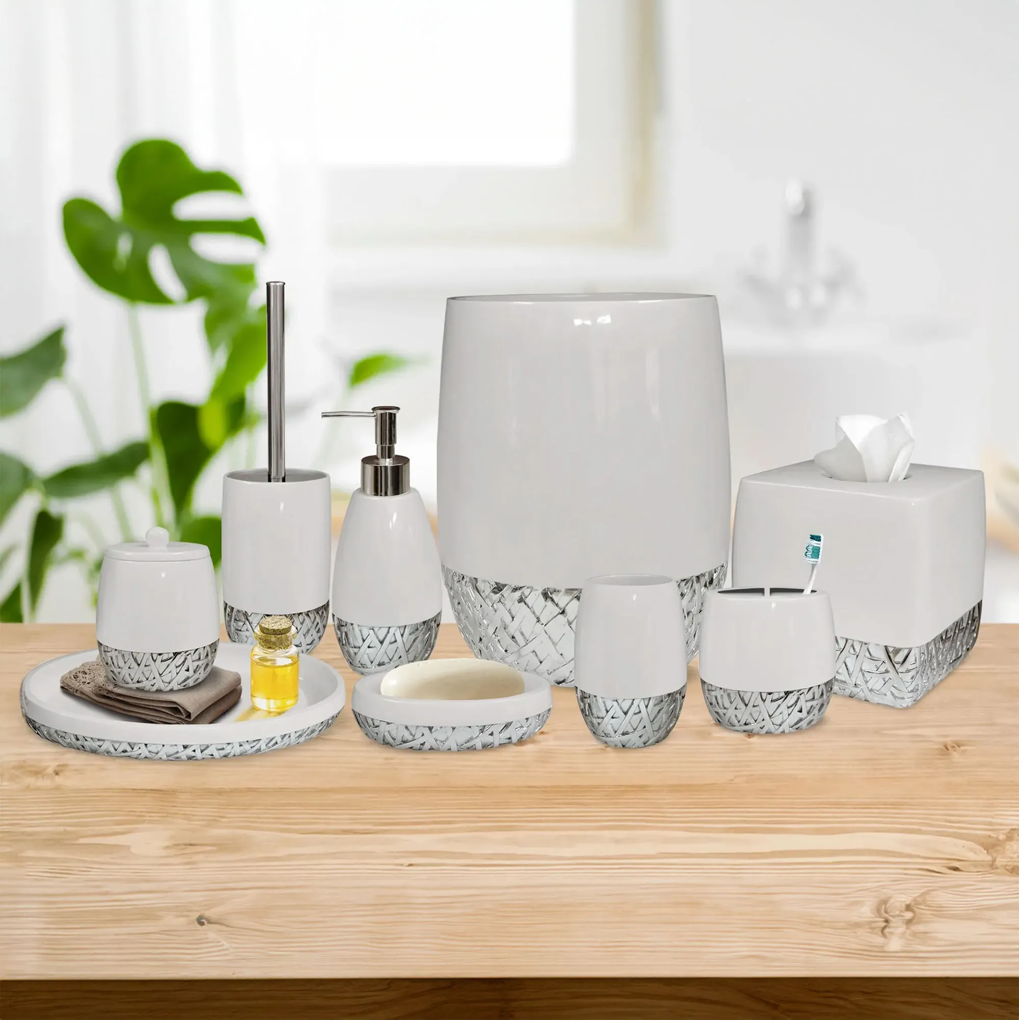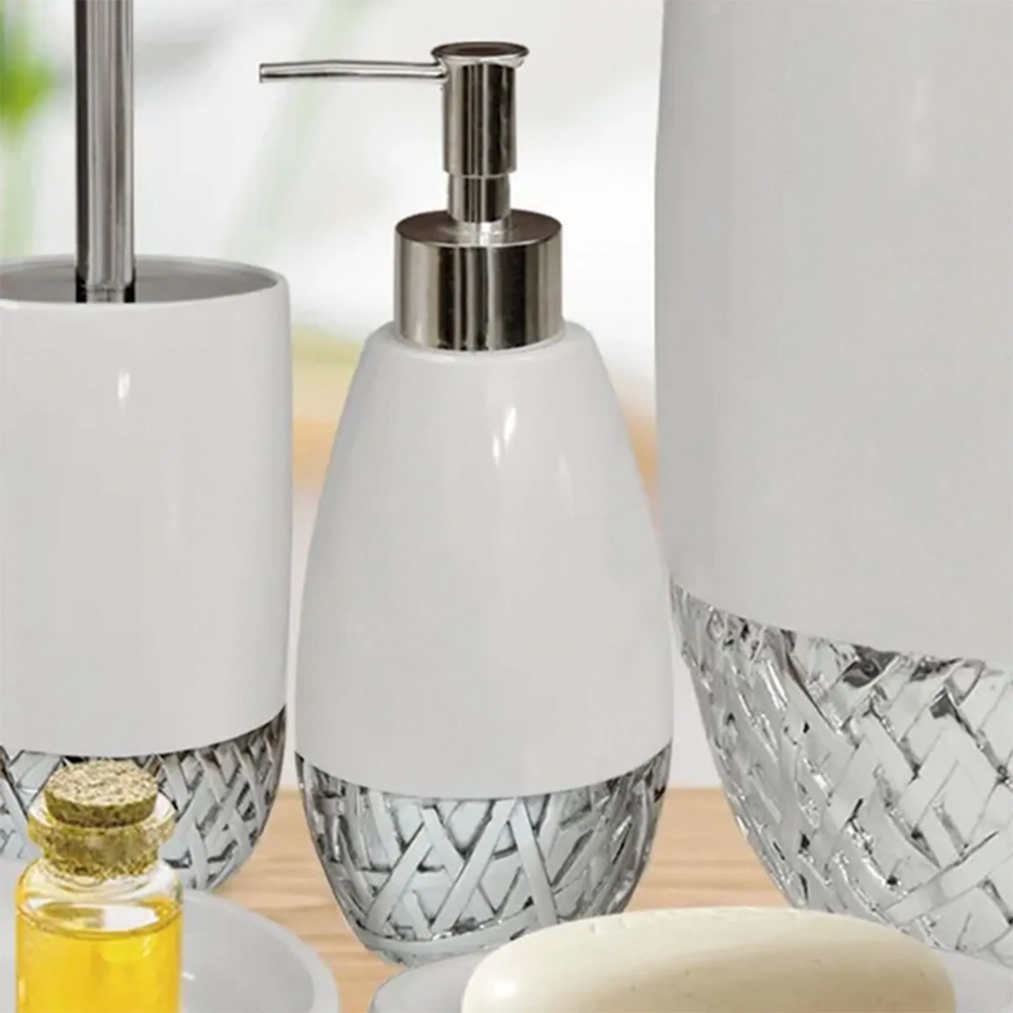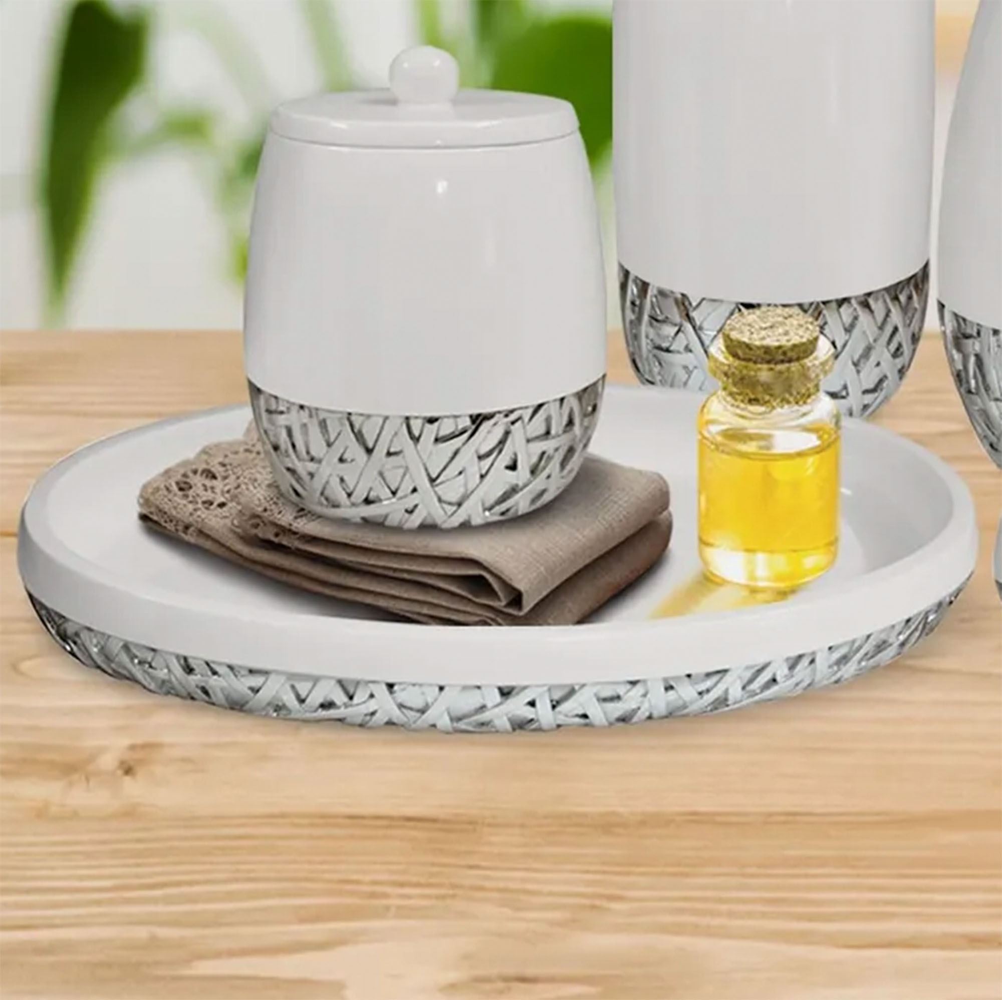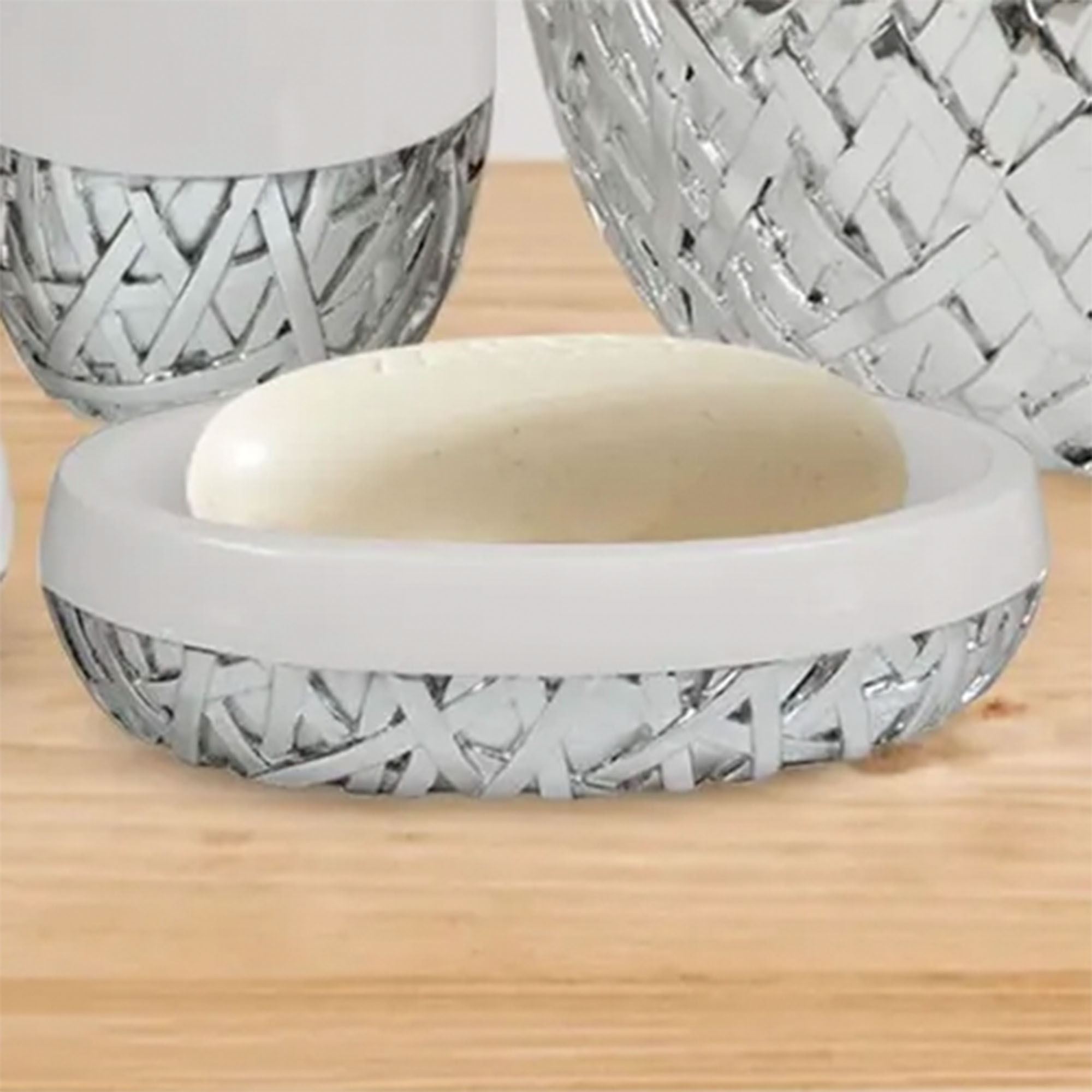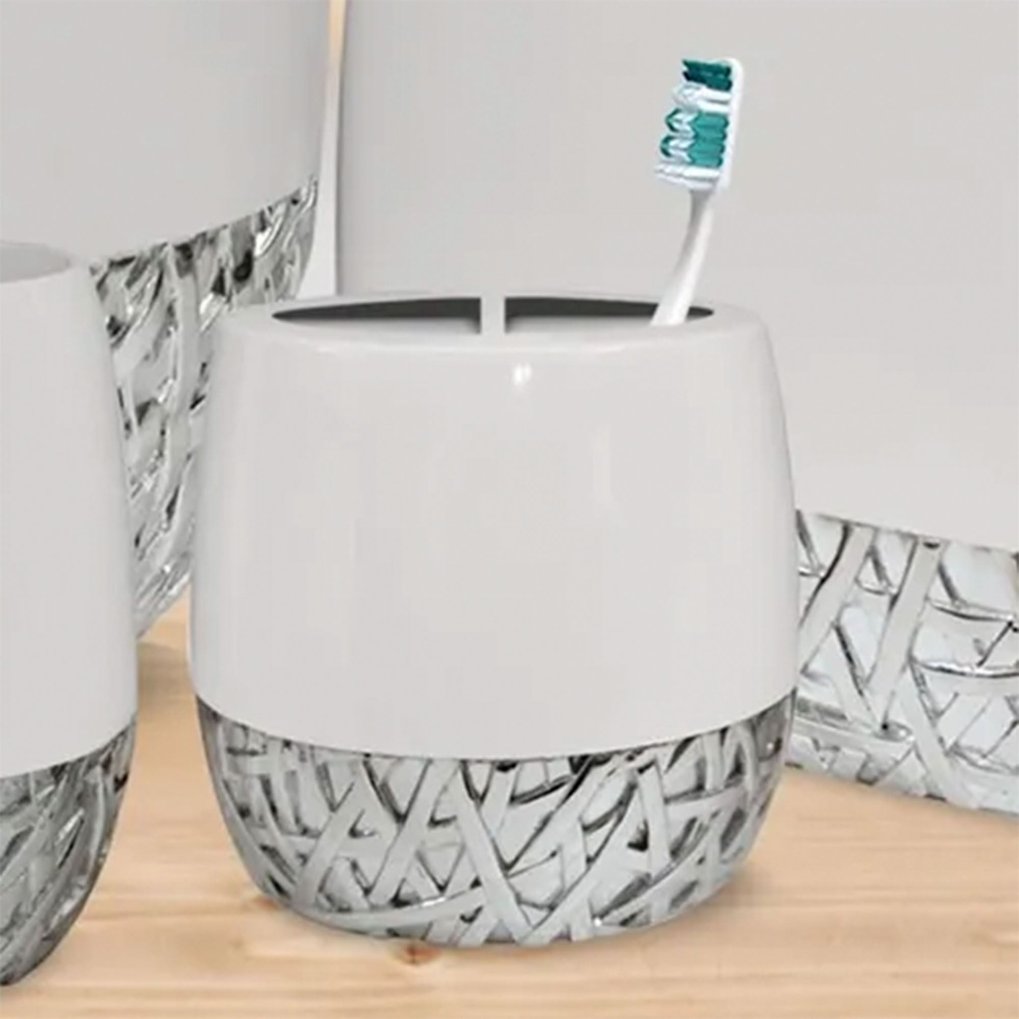 Decorate with the classy look of the Bali Bath Accessories. These resin bath accessories have a solid white top with a silver basket weave design at the bottom. The Brush Holder can hold toothbrushes or makeup brushes. Specify Lotion/Soap Dispenser, Tissue Cover, Wastebasket, Soap Dish, Brush Holder, Tumbler, Covered Jar, Tray, or Toilet Bowl Brush in Holder.