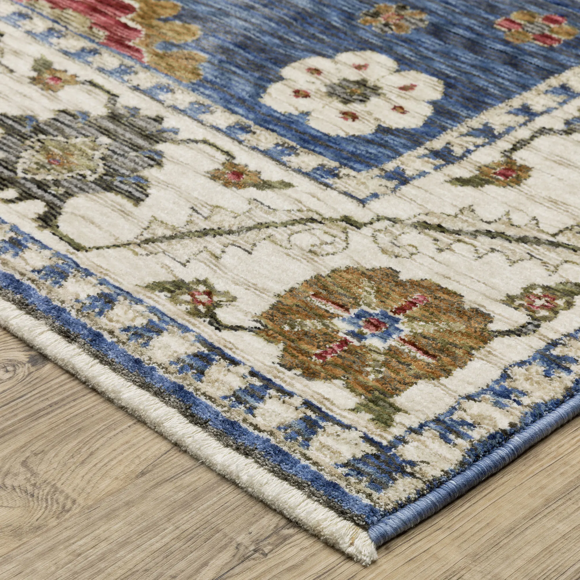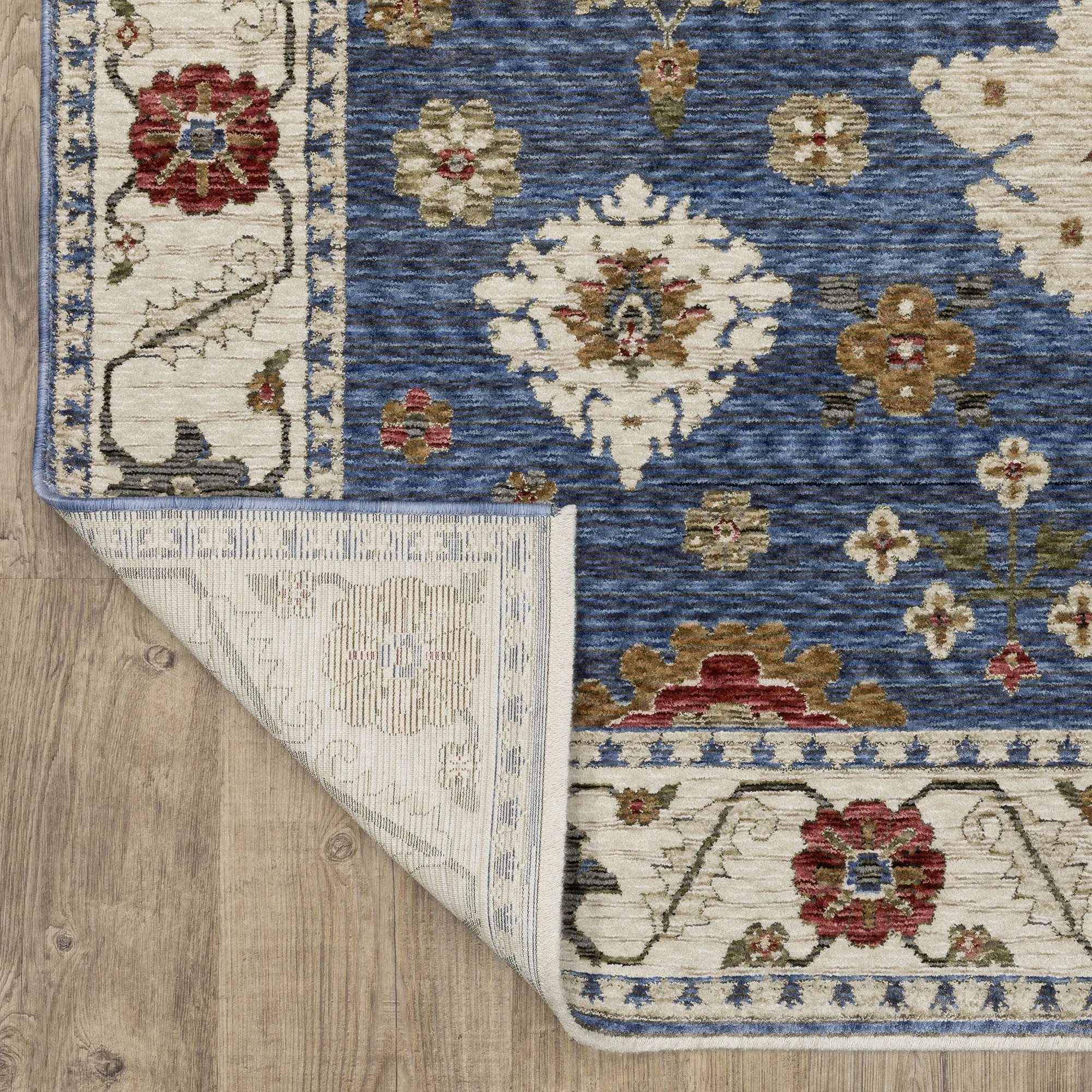 Scattered floral designs add character to the Balton Rug. This space-dyed, power-loomed polyester area rug for the living room, .27" thick, features floral medallion and acanthus leaf designs on a medium blue background. Colors include shades of burgundy, gray, taupe, harvest gold, and ivory. Length-end fringe is .5"L. Backing is woven polypropylene. We recommend professional cleaning by a rug cleaner. Imported.