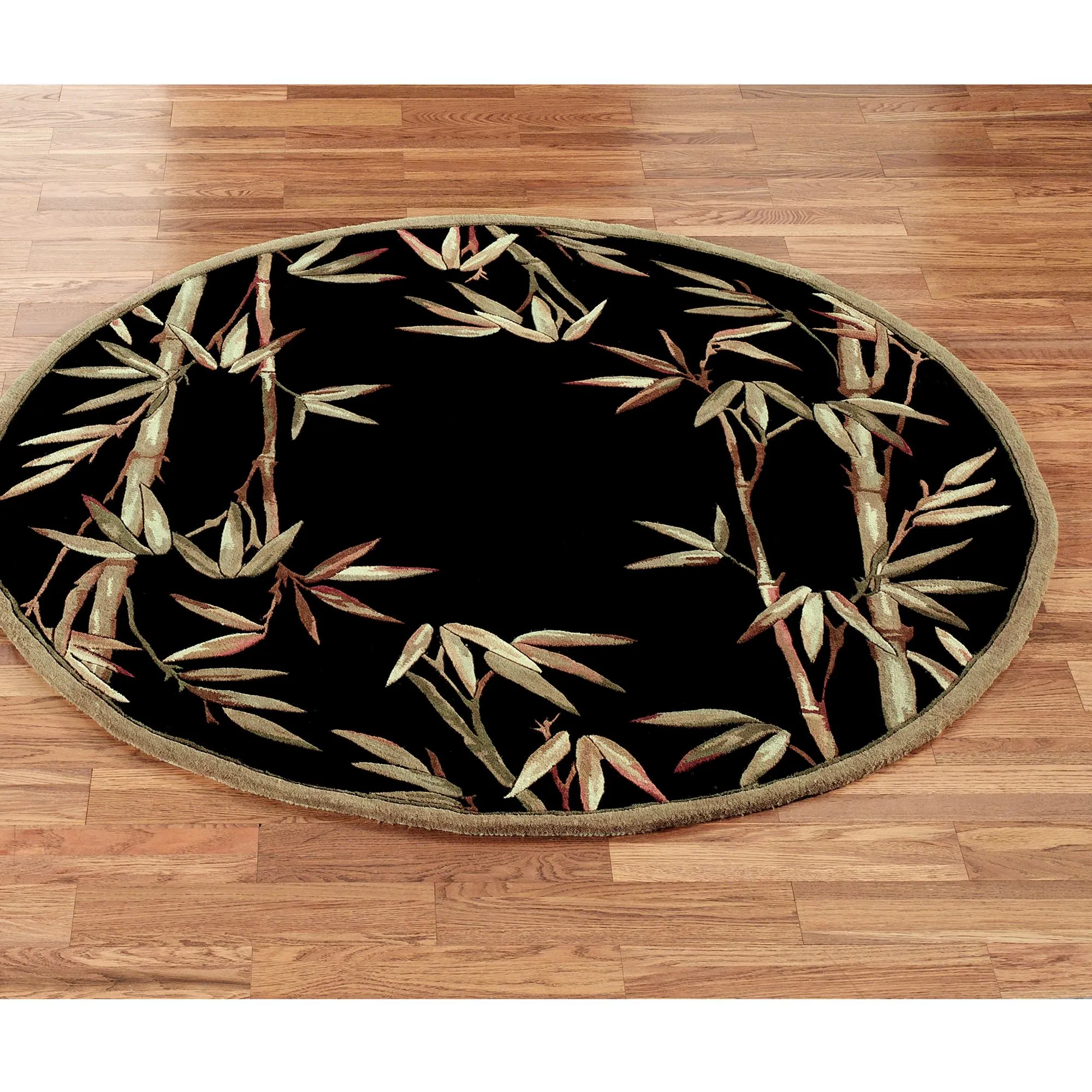 Bamboo Area Rugs feature the tropical plant displayed on a black field. The handcarved, wool floor accents, .75" thick, have an antique finish with a vegetable dyed look and abrash effect. Floorcoverings are hand-tufted in India. Design may vary by size.