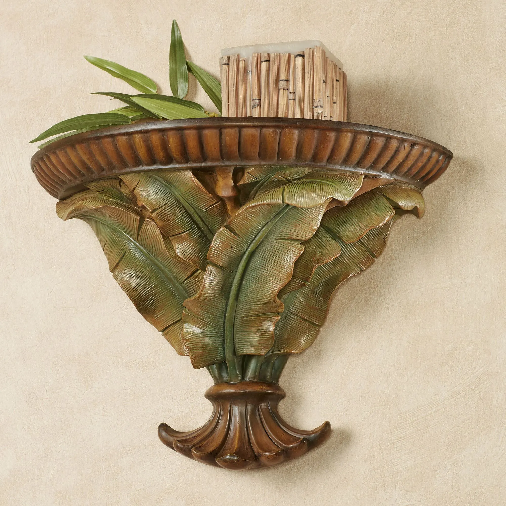 The Bamboo Tropics Wall Shelf exhibits exotic splendor. Made of resin, this handpainted wall shelf has a brown finish on the top and sage green palm leaves with russet edges and subtle bamboo stalks. Tropical wall shelf measures 15"Wx7"Dx11"H.