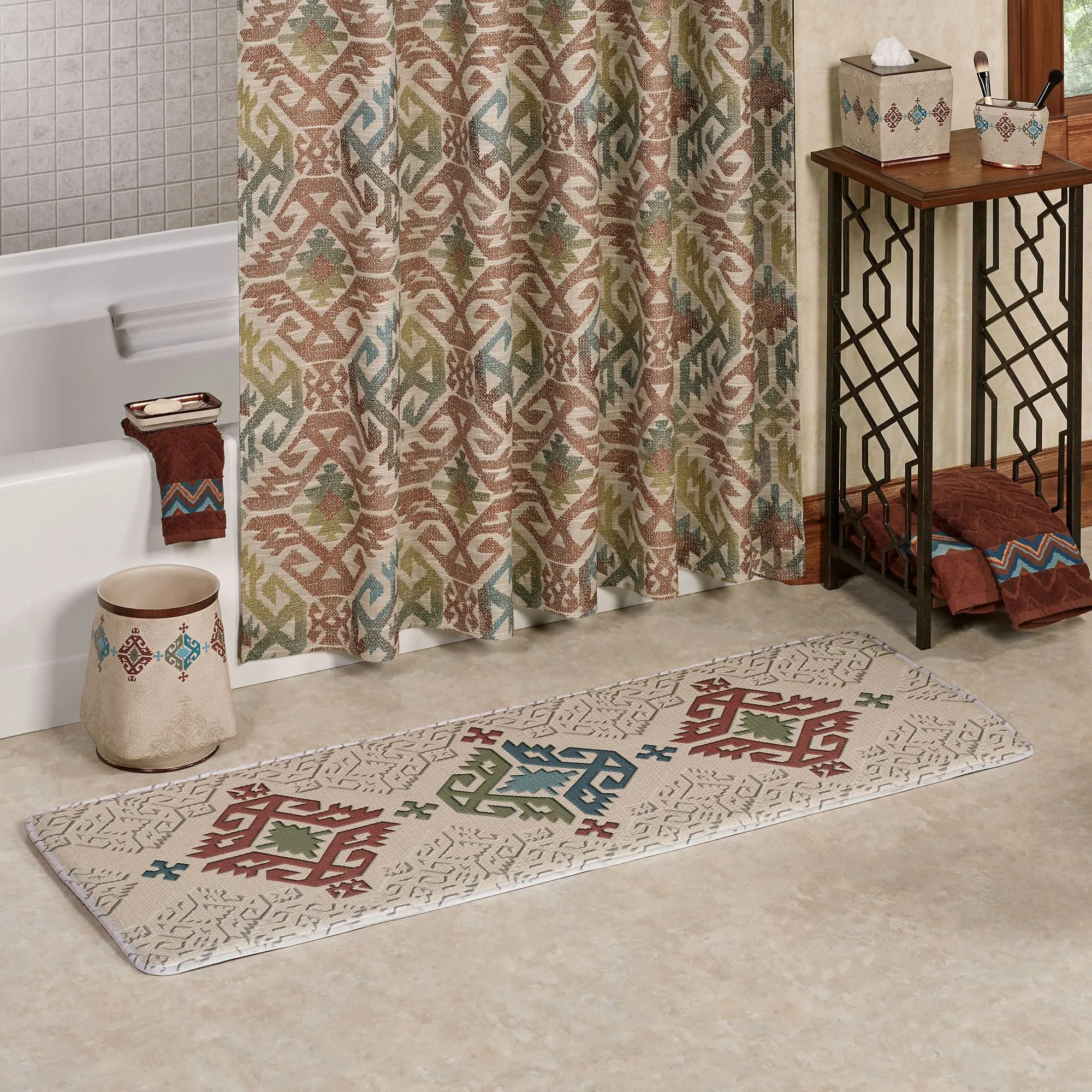 The Bandera Southwest Cushioned Runner Mat is polyester with polyurethane memory foam fill and rubber backing. Imported/USA.