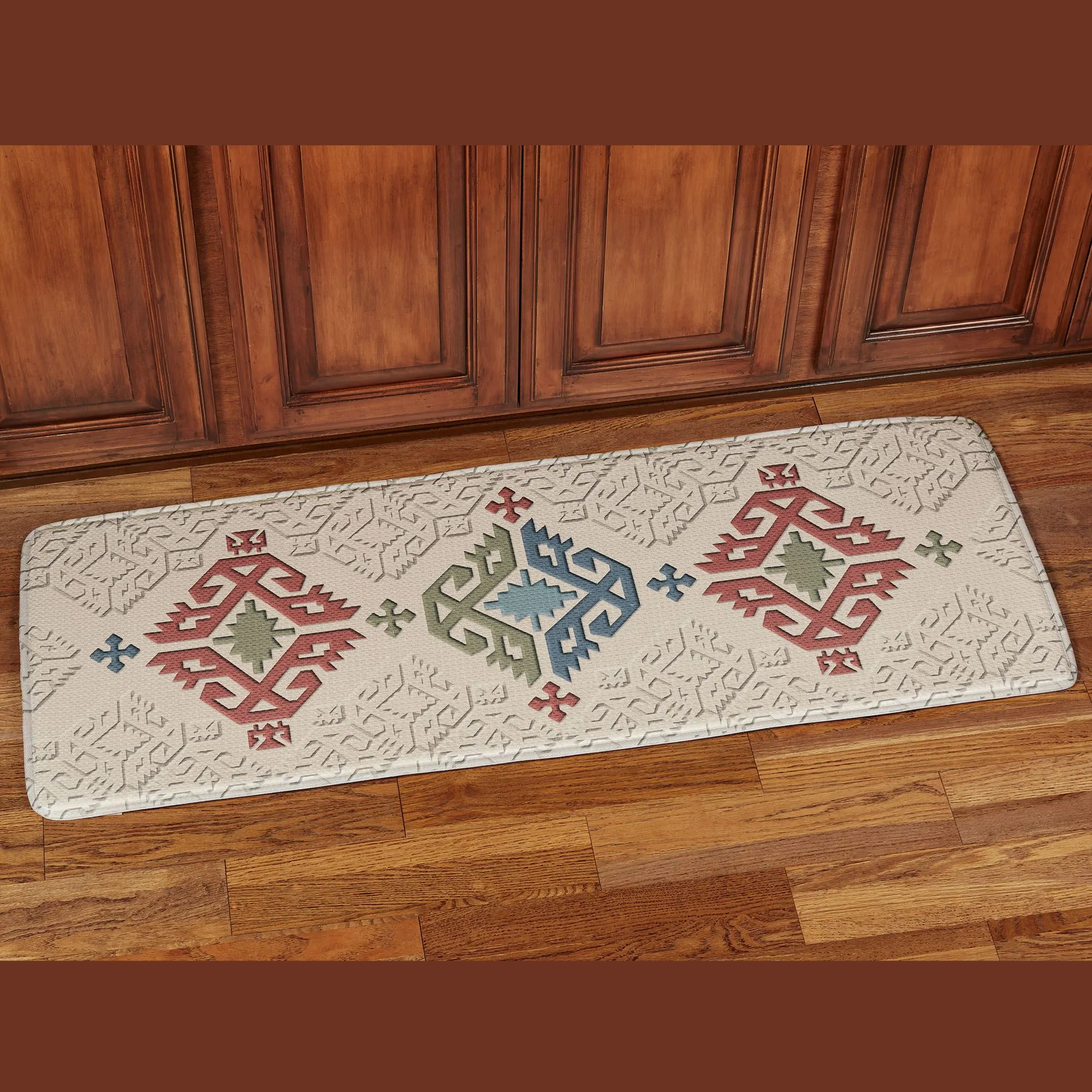 Ornate medallions decorate the Bandera Cushioned Runner Mat with Southwestern luxury. Made of polyester, this memory foam comfort mat, .375" thick, has a heat-transferred print in shades of cinnabar, teal, sapphire, and sage on a natural background. Rubber backing is skid-resistant. Fill is polyurethane. Cushioned runner mat is 55"x20". Machine washable. Imported/USA.