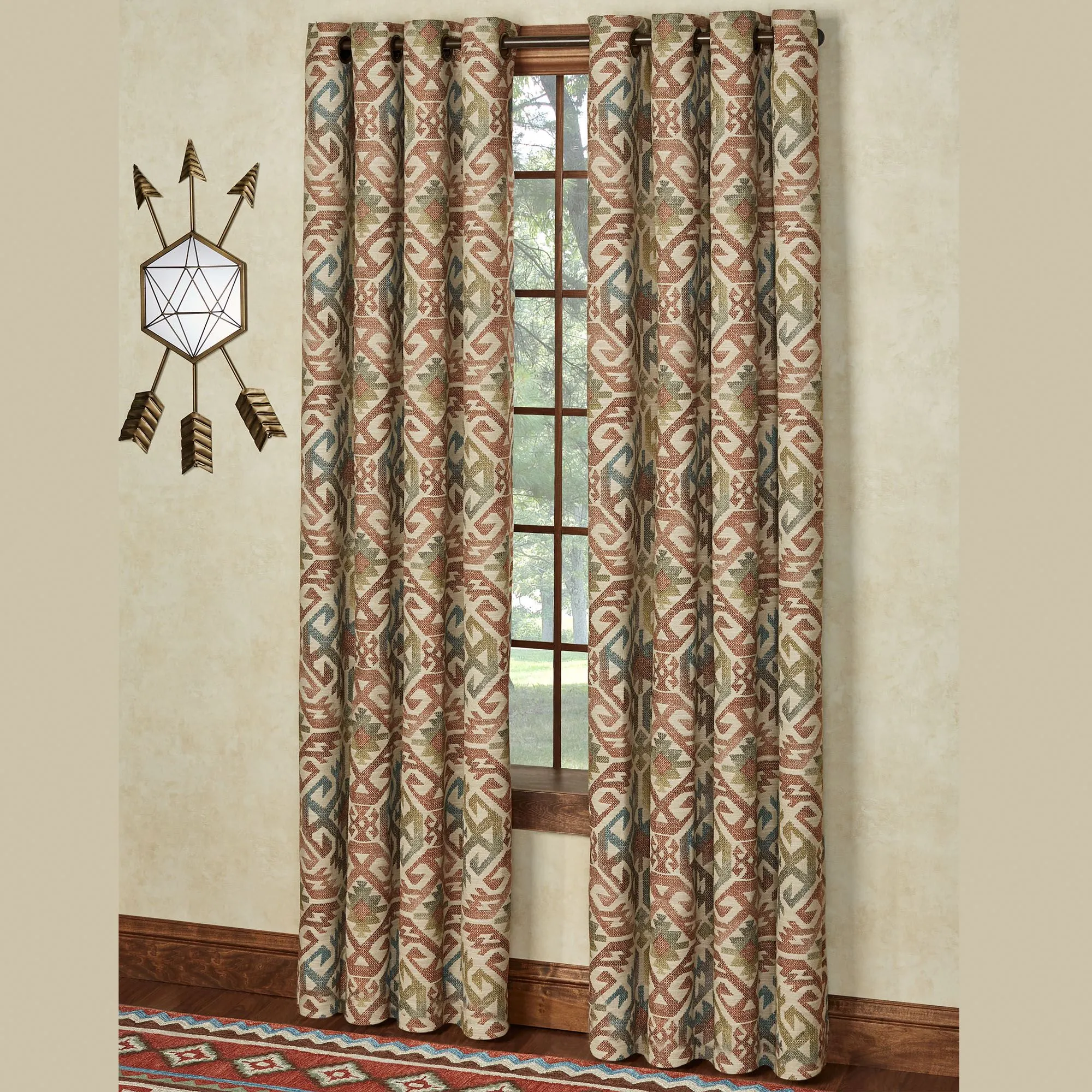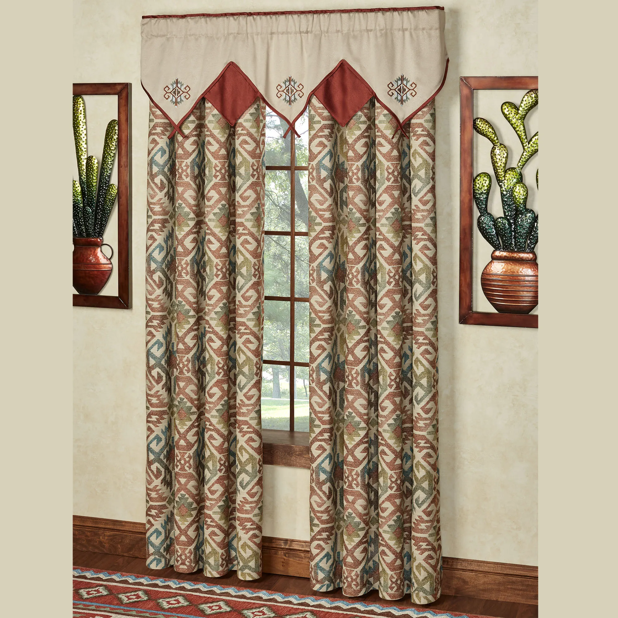 It's hard to resist the Southwestern charm of the Bandera Window Treatment. Made of polyester, this rugged, woven window treatment has a welcoming ambience and medallion designs. Specify Layered Ascot Valance or Wide Grommet Curtain Pair. The woven, Layered Ascot Valance has a top layer with embroidery on natural, tie ends, and a bottom layer of solid cinnabar. Rod pocket is 3". The Wide Grommet Curtains have all-over medallions in striking shades of cinnabar, sage, moss, teal, sapphire, and taupe on a natural background. Curtains include tiebacks. Metal grommets, 1.75" dia., have a bronze finish. Dry clean. Imported. The curtain pair width is the total width of two panels together.