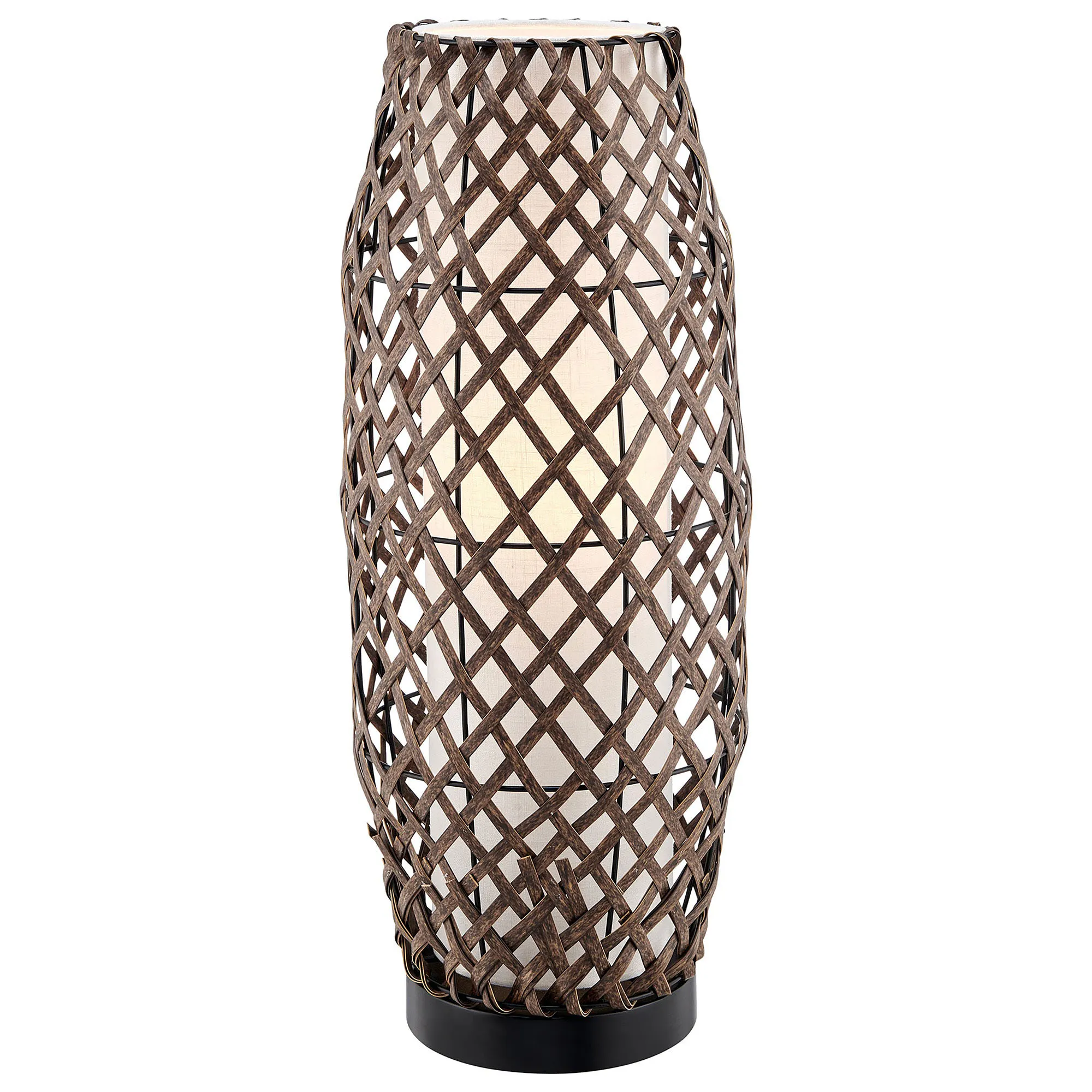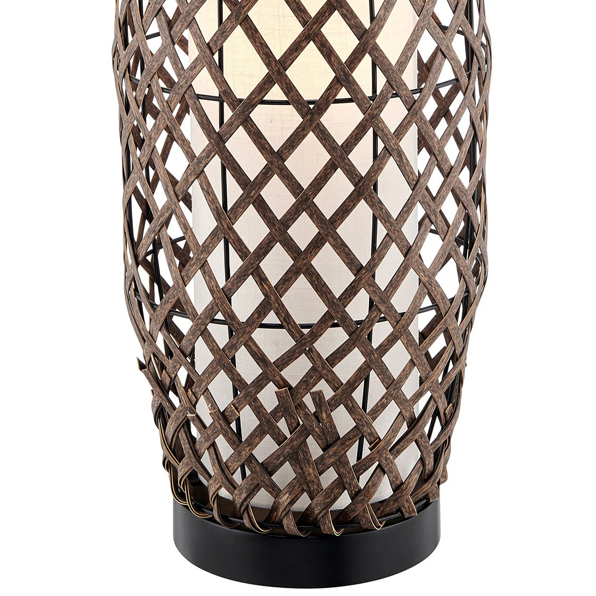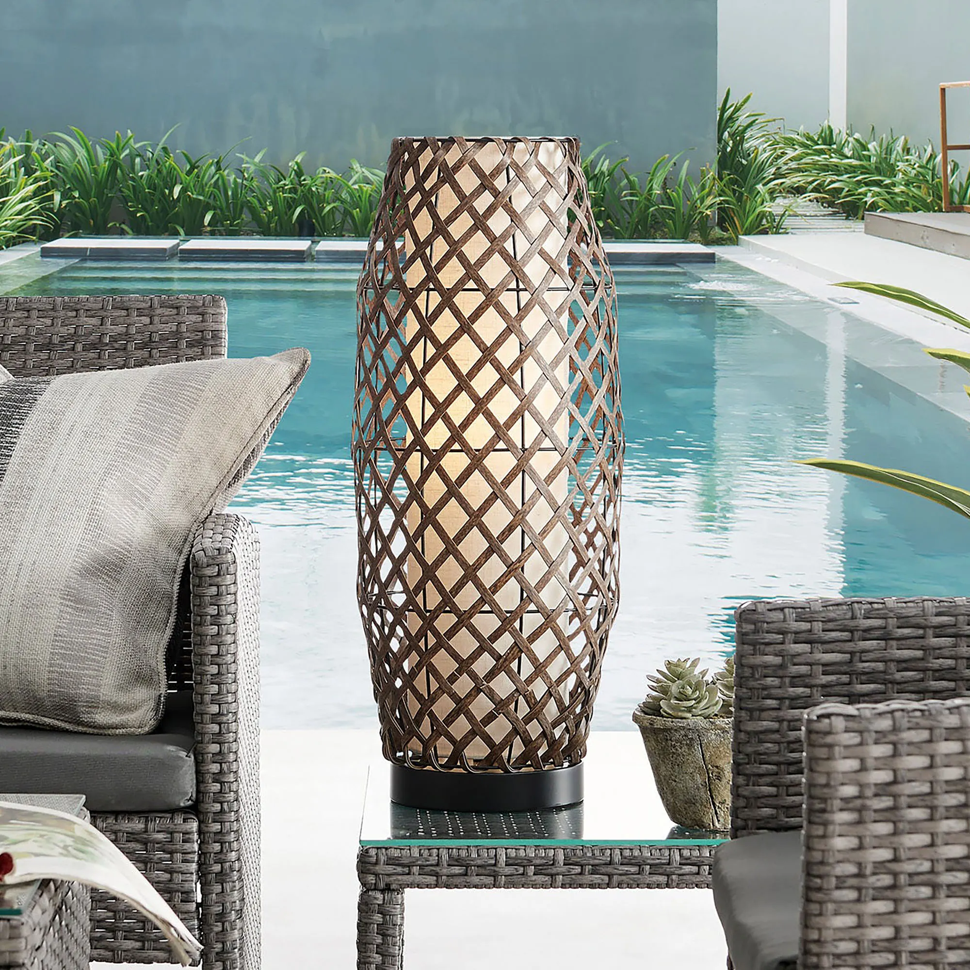 The lattice pattern on the Baran Table Lamp adds intrigue to your patio or outdoor space. Made of metal, this lantern has an oblong shape, a brown woven PVC lattice pattern, and a black metal base. The cordless lamp has an inner white weatherpoof fabric shade and requires one dimmable and rechargeable 5.6W LED bulb, included. The on/dim/off button is located on the bottom of the bulb; simply remove the bulb to adjust the light. A fully charged bulb can provide up to 24 hours of continuous light. A charging cord is included. Indoor or outdoor seasonal use; do not expose this lamp to freezing temperatures. UL listed. Measures 9.5"dia.x23"H.