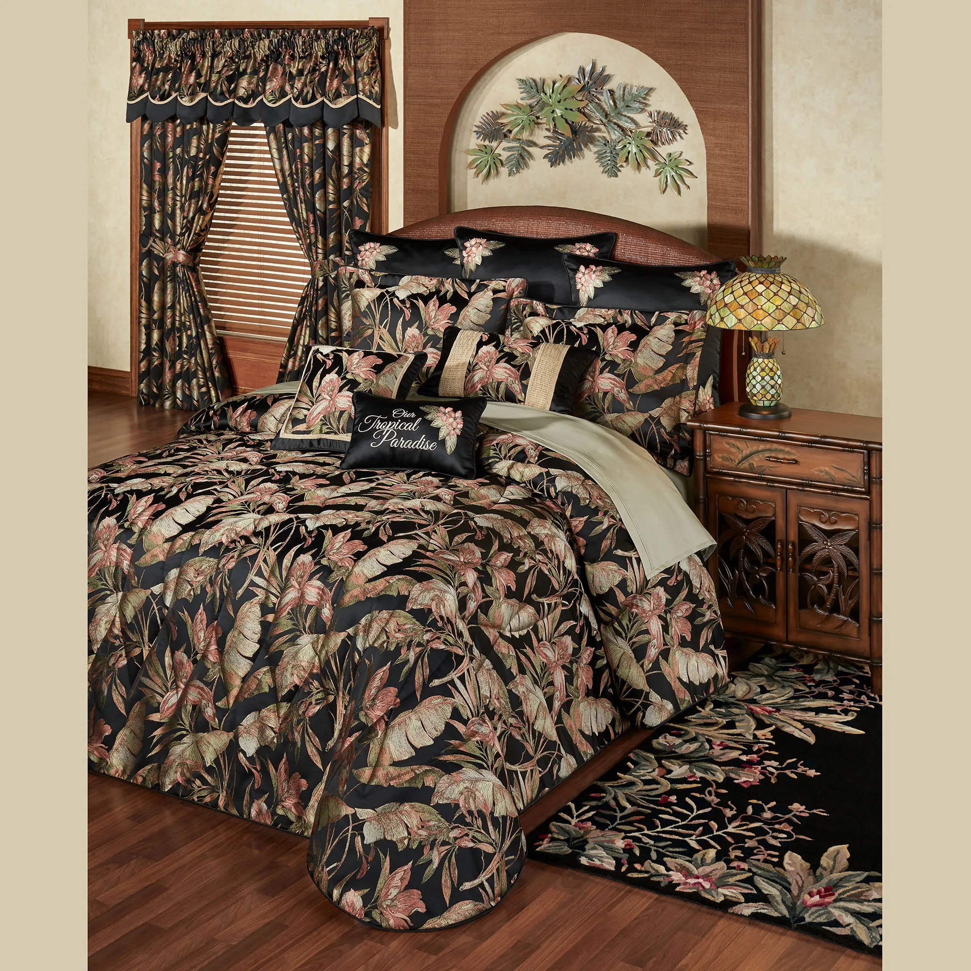 As the sun sets on the isle of Barbados, palm leaves and flowers bask in the last rays as darkness falls. An exclusive Touch of Class(R) design by J. Queen New York, the jacquard-woven polyester bedding ensemble features coral, sage, taupe, and gray tropical flora against an inky black ground.