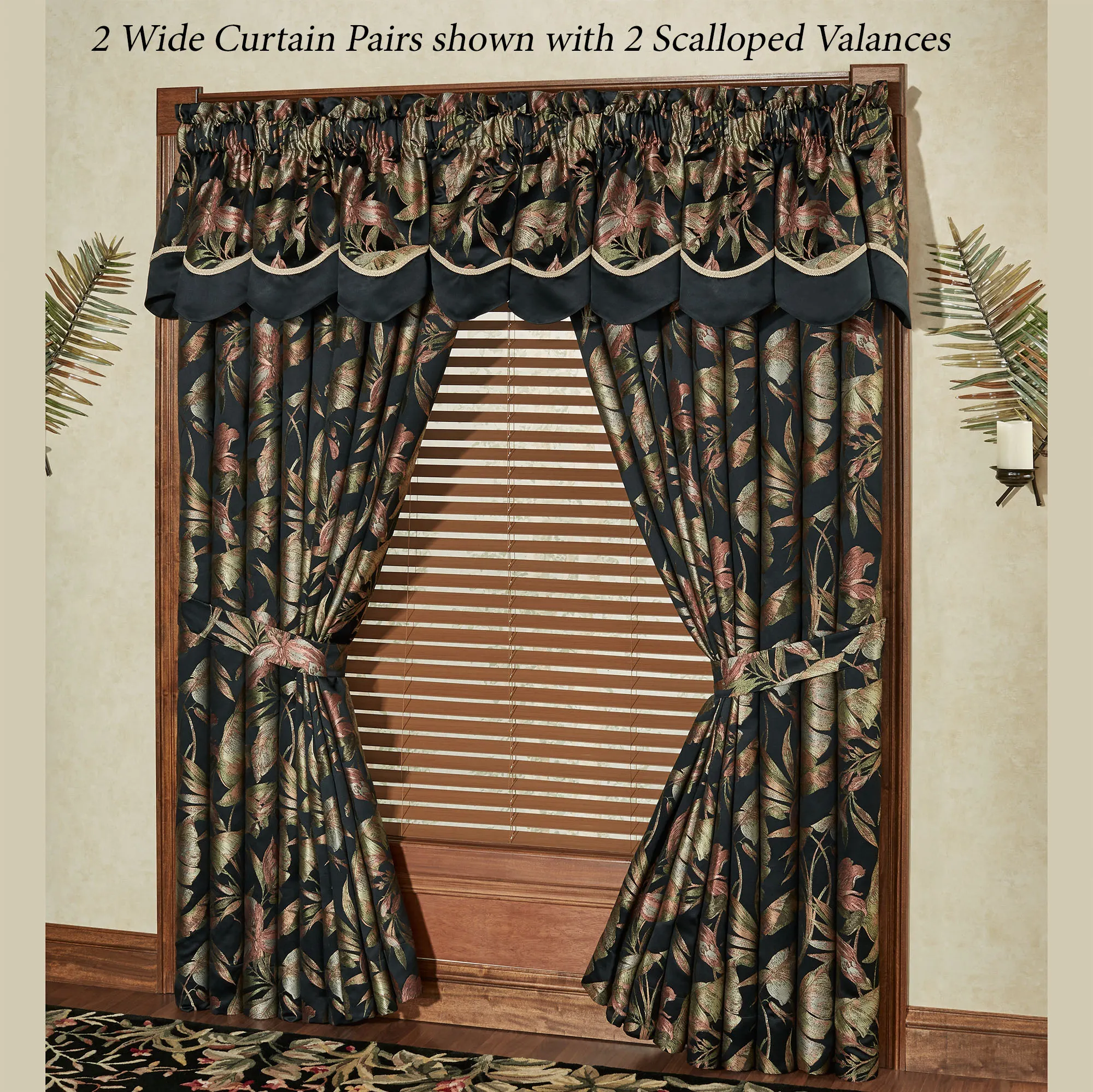 Window Treatment has 3" rod pockets. The lined Wide Curtain Pair has tropical flora and tailored edges. Tiebacks are included. Each Ascot Valance is black with floral embroidery. Scalloped Valance has a tropical flora top pieced with gimp trim accents and a black bottom.