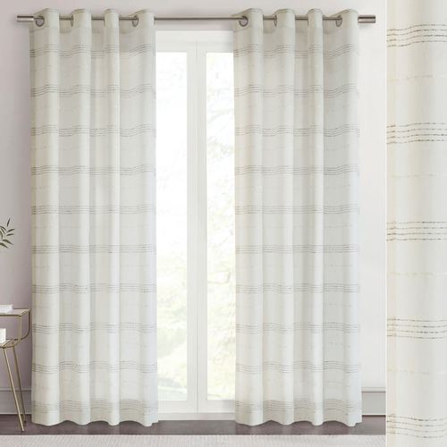 The Barberry Window Panel decorates with a classy variegated stripe pattern. This sheer polyester panel has a gray design on white and 1.5" dia. metal grommets with a brushed silver finish. Sold individually, each striped curtain panel is 52"W. Machine washable. Imported.