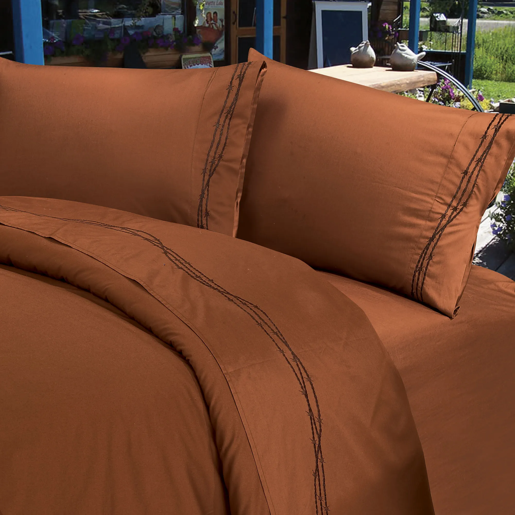 Ideal for a Southwest bedding ensemble, the Barbwire Sheet Set is a soothing addition to your nightly repose. Bed sheets are 350 thread count, cotton sateen with barbwire design embroidery on hems. Twin is a 3-piece sheet set with 15" deep pockets. The flat sheet is 66"x96"; the fitted sheet is 39"x76"; and the pillowcase is 20"x30". Machine washable. Imported.