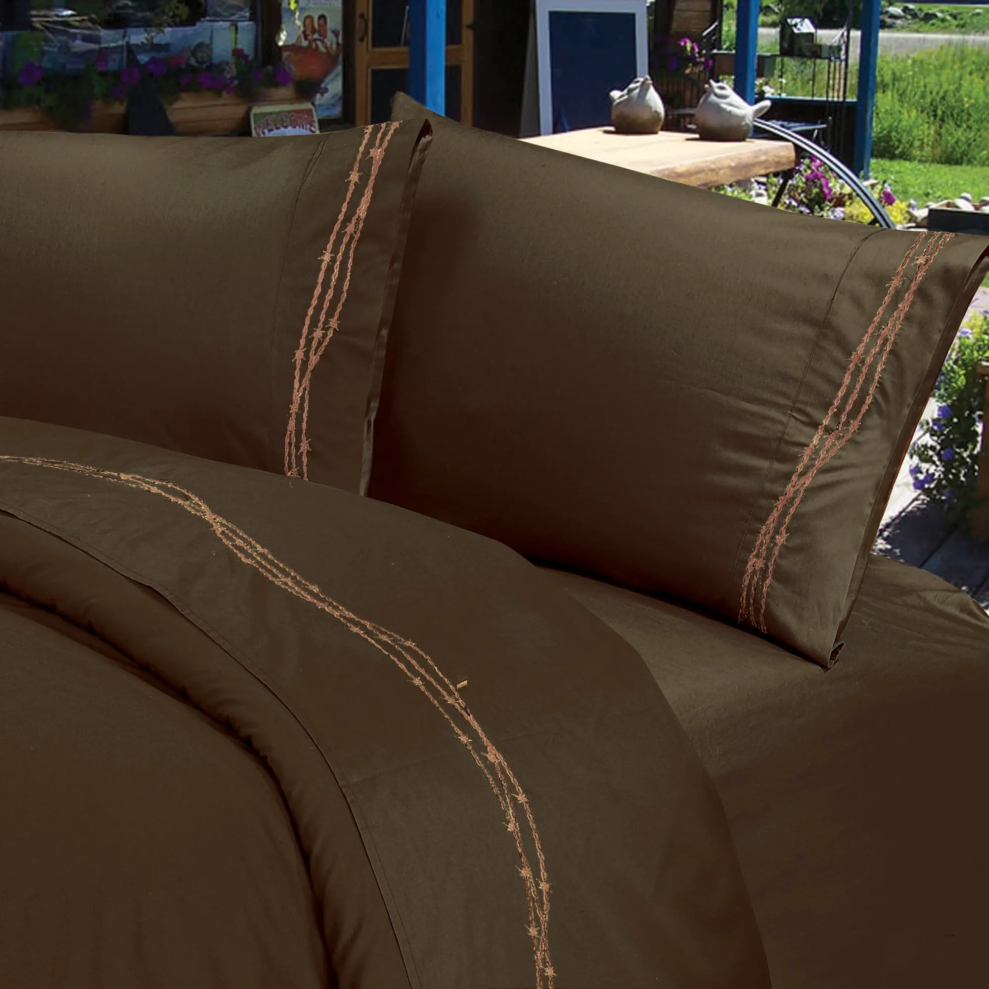 The ideal complement for a Southwestern bedding ensemble or any bed that could use a touch of rustic style, the Barbwire Sheet Sets are a sleek and soothing addition to your nightly repose. Flat sheet and pillowcase(s) have self attached hems; fitted sheet has elastic all around.