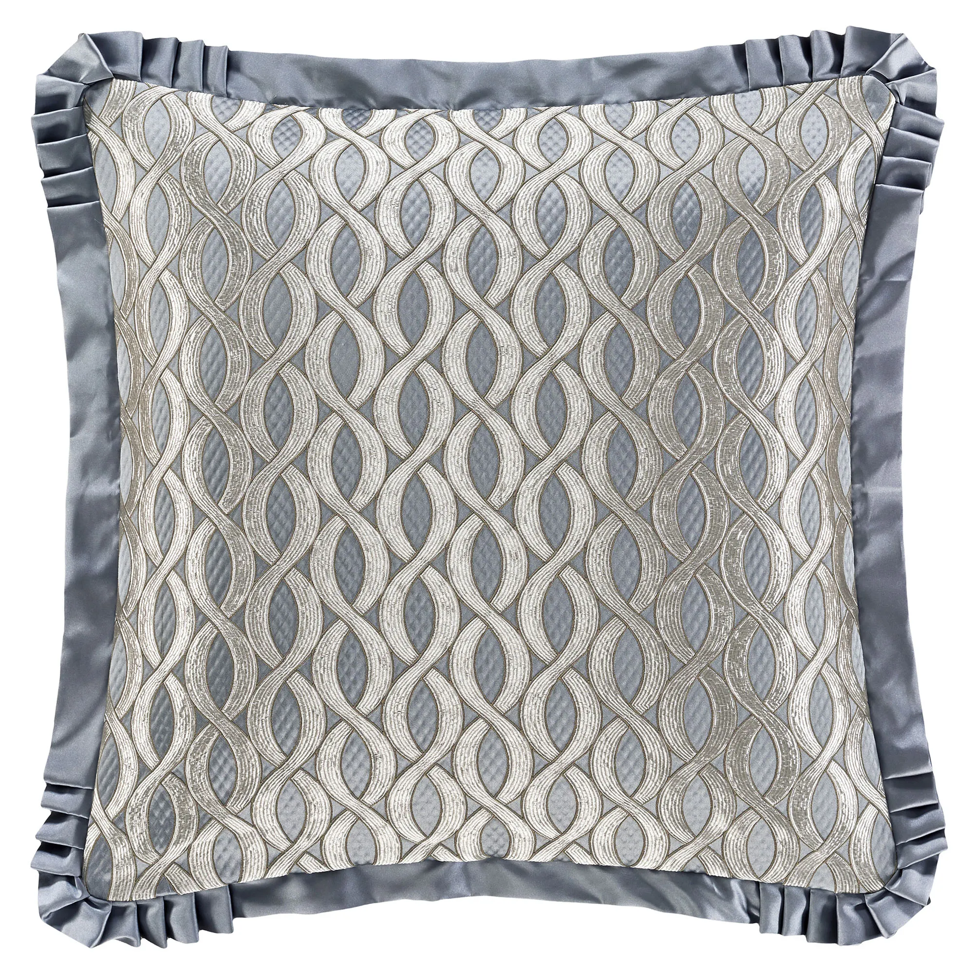 The flanged European Sham has interlocking and diamond designs, pleated corners, and a zipper closure; reverses to sterling blue diamond designs.