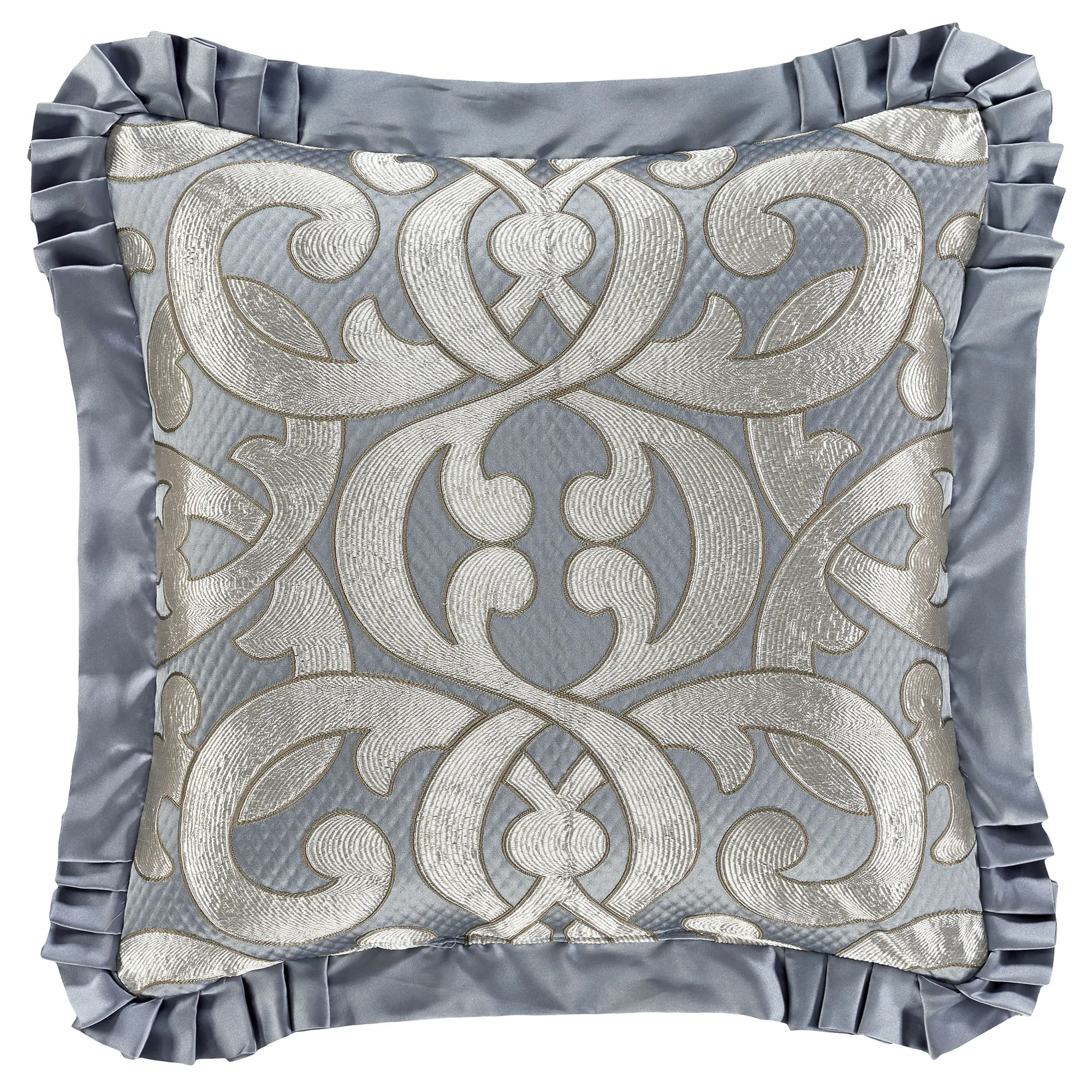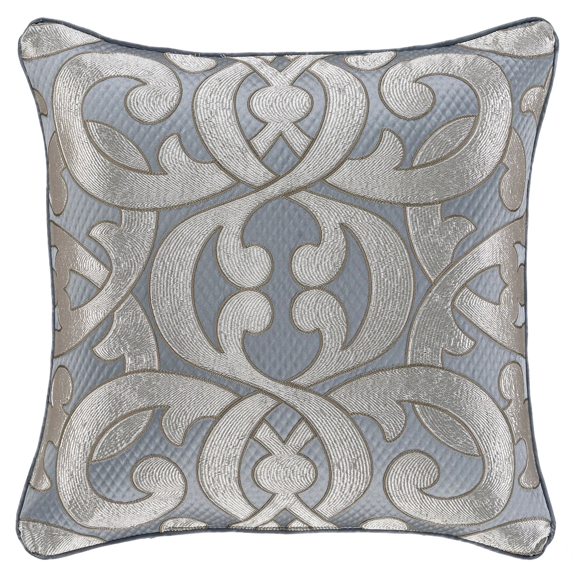 The grand-scale motifs on the Barocco Bedding are the epitome of sophisticated elegance. Made of polyester, this ensemble, by J. Queen New York, features a woven-jacquard interlocking damask pattern. The pattern has a unique finishing process that is applied to give the appearance of an appliqued technique for added dimension. Colors are sterling silver and sterling blue.