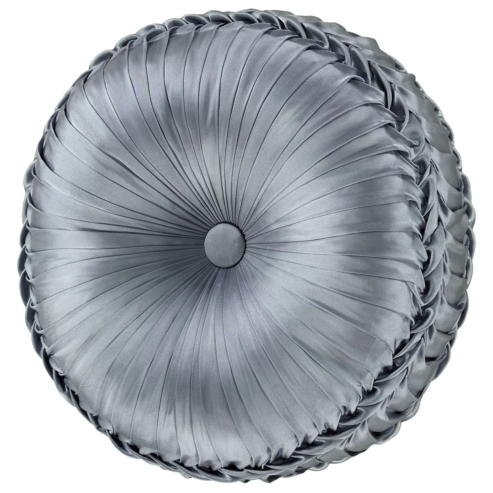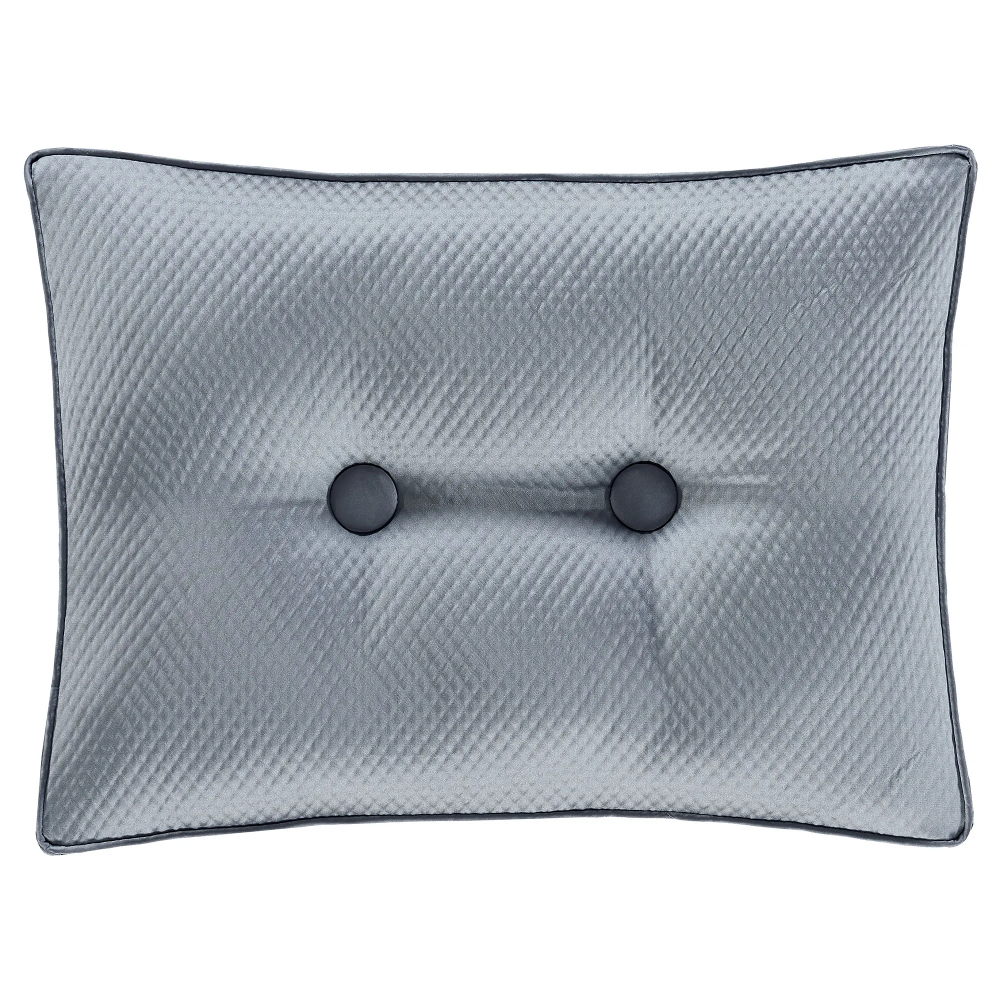 Pillows: The Piped Square has damask designs and reverses to interlocking and diamond designs. The Flanged Square has damask designs and pleated corners; reverses to interlocking and diamond designs. Handmade, pleated Round is sterling blue with a central button tuft and a 3" side gusset; round pillow is reversible. The piped Tufted Rectangle has diamond designs, two central button tufts, and a 2.5" side gusset; reverses to diamond designs. Piped Jumbo Rectangle has interlocking and diamond designs and a 2.5" side gusset; reverses to diamond designs.
