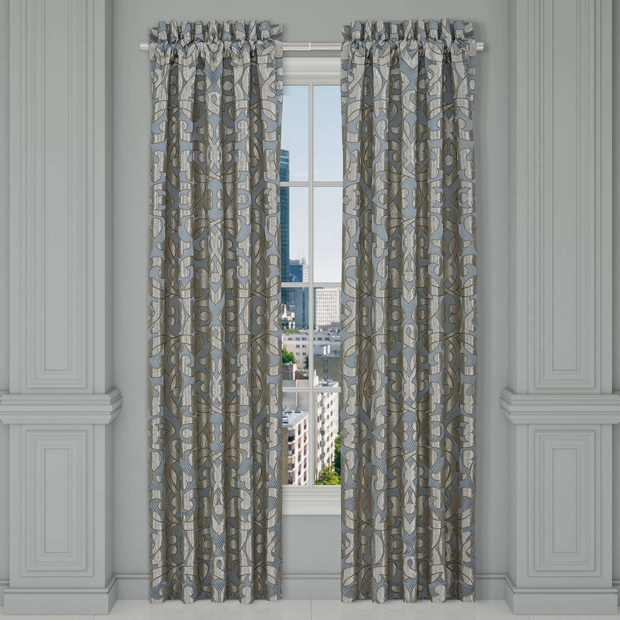 Window Treatment: Wide Curtain Pair has a 3" rod pocket and is 100"W; choose 84"L or 95"L. Each Ascot Valance has a 3.25" rod pocket and is 40"Wx21"L.
