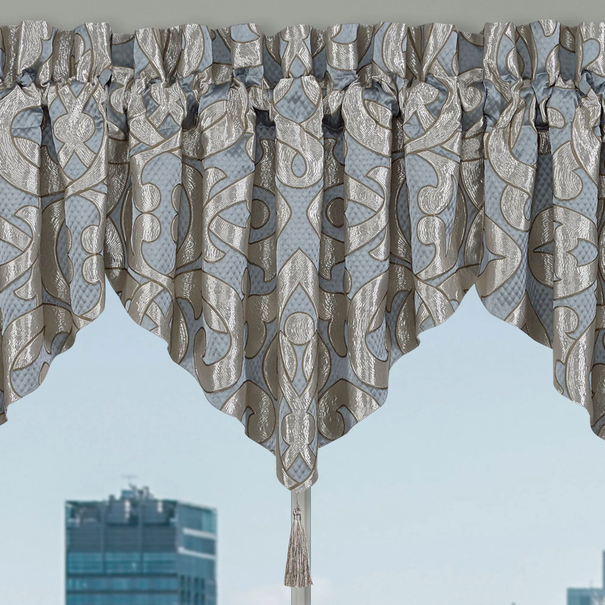 Lined Window Treatment has damask designs. The tailored Wide Curtain Pair includes tiebacks and has a 3" rod pocket. Curtains are available in two lengths. Each Ascot Valance has an end tassel and a 3.25" rod pocket.