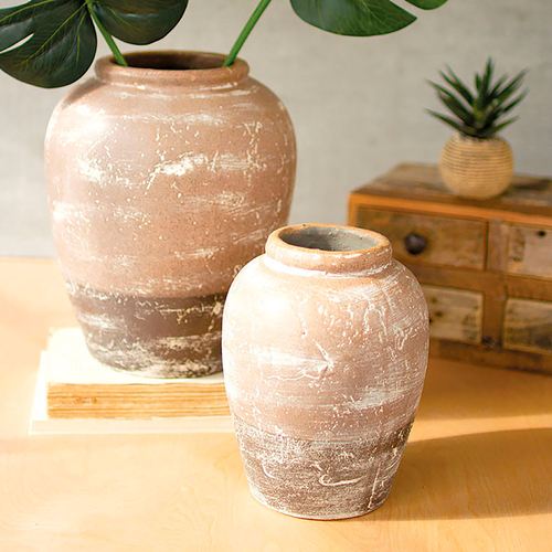 The Barren Vase Set resembles Southwestern-style pottery. These ceramic vases have rustic light and dark brown shades along with white distressing. Decorative vases are perfect for faux or dried floral arrangements. Small is 7"dia.x9"H and has a 4" dia. opening; large is 9"dia.x12"H and has a 6" dia. opening.