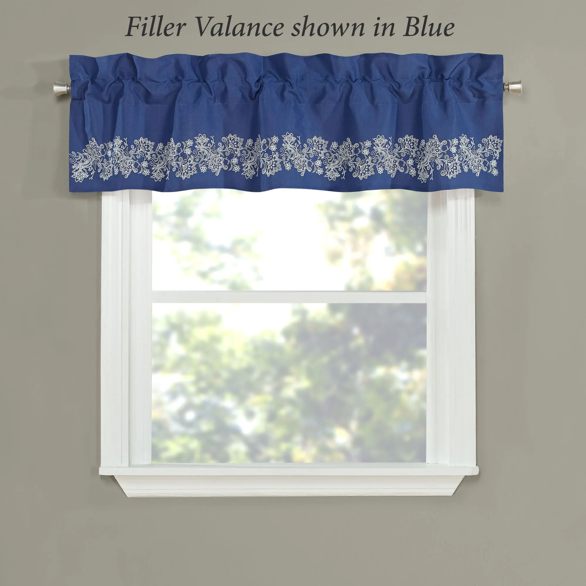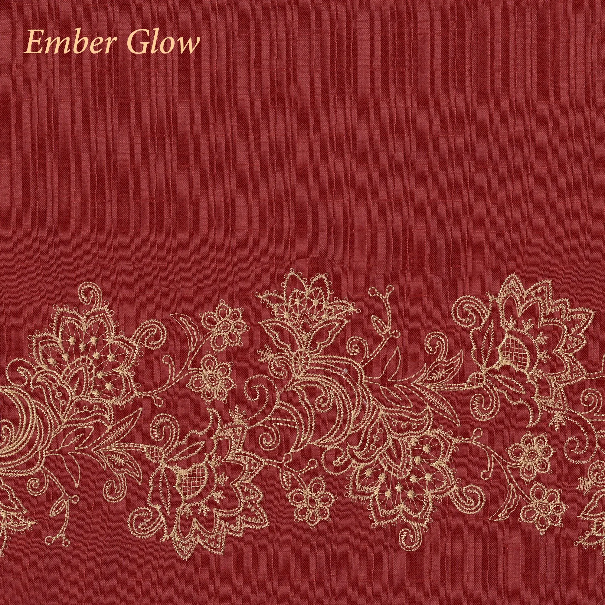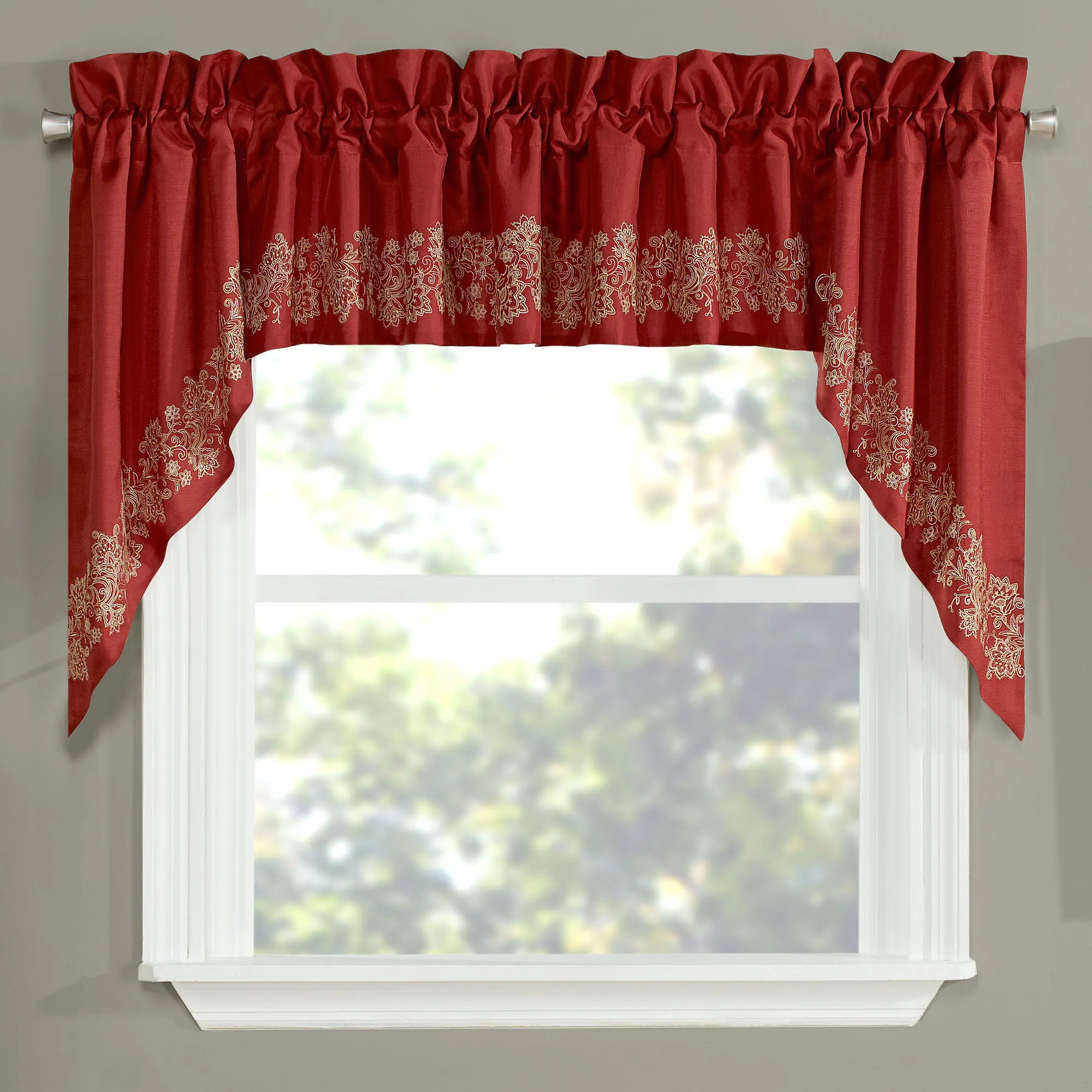 Intricate Jacobean florals add a sweet beauty to the Barrie Window Valances. Each lined, polyester window accent features a slubbed solid hue embroidered with elaborate florals. Ember Glow has light gold designs. Blue contains light cream patterns. Rod pockets measure 3.25". The three-piece Swag Valance Set includes one center valance and a swag pair, measuring 102"Wx63"L. Machine washable. Imported.