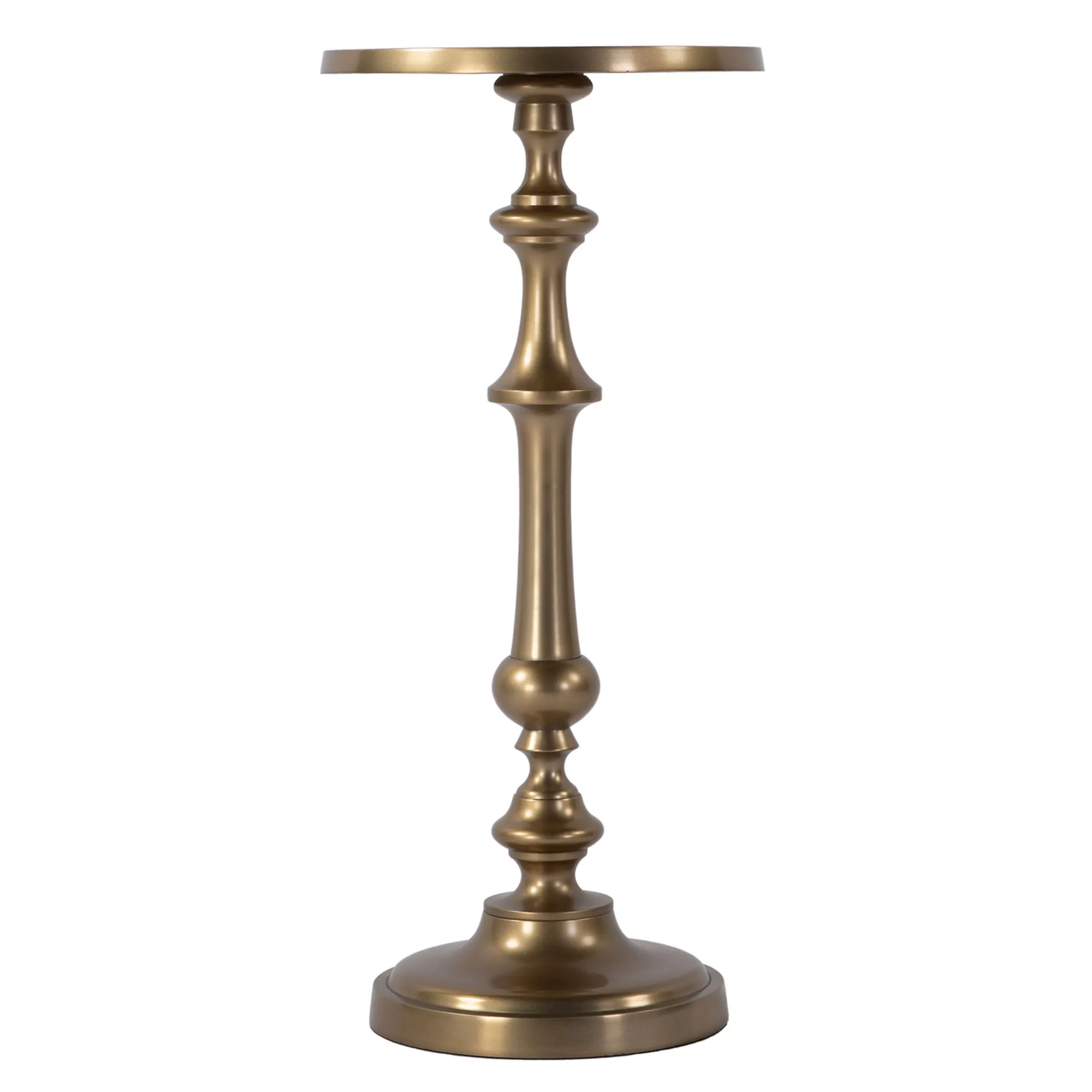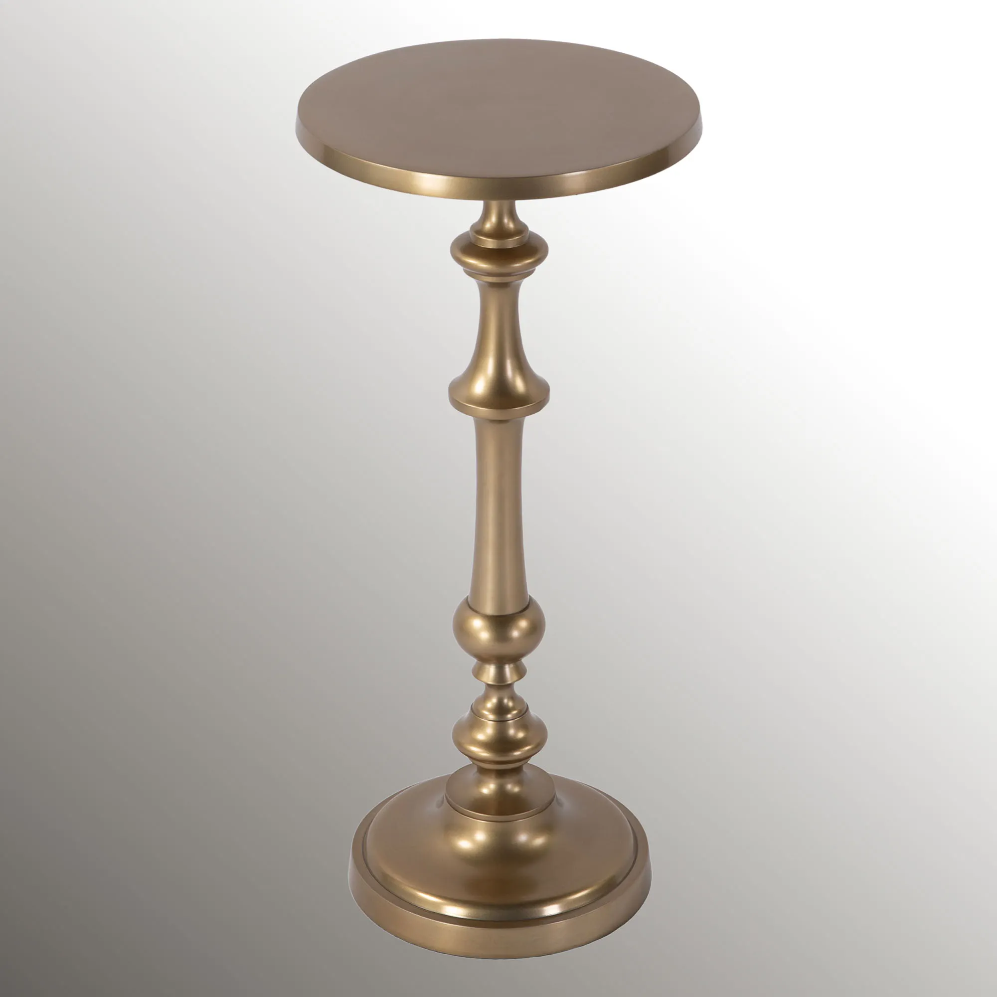 Place the Bartel Pedestal Table in any setting. This lightweight aluminum pedestal table, from Butler Specialty, has a powder-coated satin gold finish. The top and bottom base are round. Felt protectors on the base prevent scratching and scuffing. The maximum recommended weight is 25 lbs. Pedestal table measures 10"dia.x22"H.