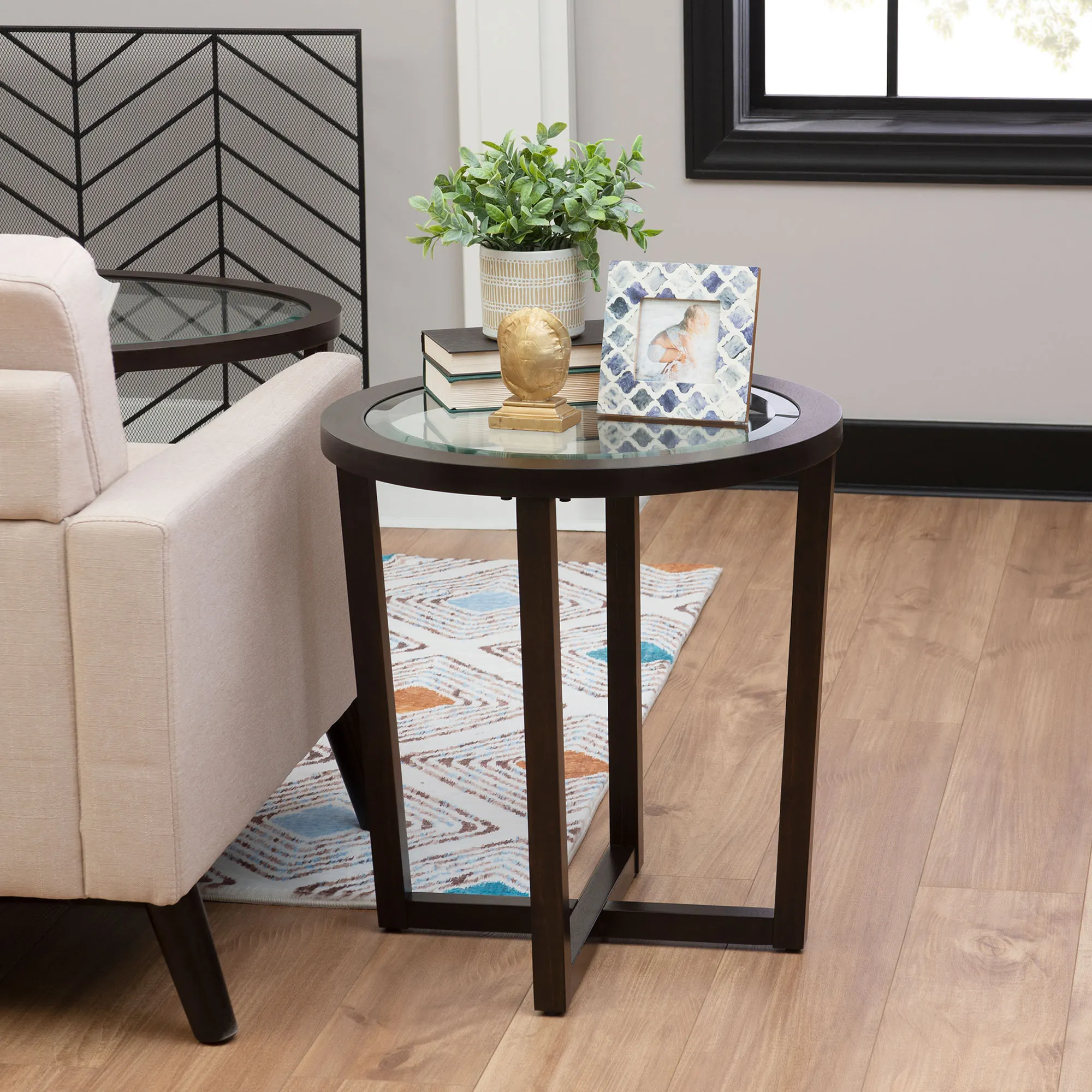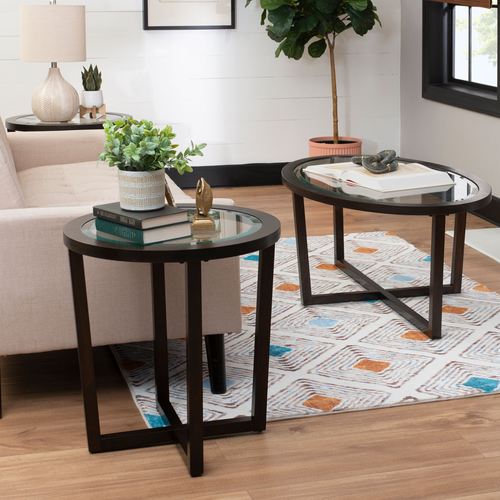 The Basilia Espresso Table Set styles a space with sleek, understated charm. With a crossing base, each espresso-finished wooden frame features crisp lines that elevate the tempered glass tabletops. Each beveled, clear glass top allows natural light to pass through for a modern feel. The three-piece table set includes one oval coffee table and two round end tables. Coffee table measures 46.5"Wx28.5"Dx19"H overall; maximum weight recommended is 100 lbs. Each accent table measures 22"dia.x24"H overall; maximum weight recommended is 40 lbs. Overall, the set weighs approx. 51 lbs.