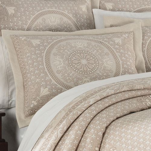 Floral and scroll medallion designs are intricately displayed on the Basset Standard Sham Pair. Made of cotton, these sophisticated, thick woven matelasse shams have hues of vanilla, light almond, light taupe, and dark beige. The flanged shams each have a central medallion and a French cuff closure. Machine washable.