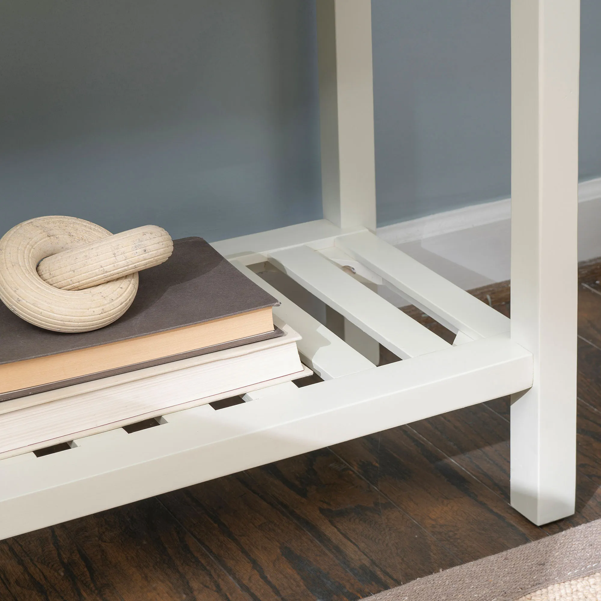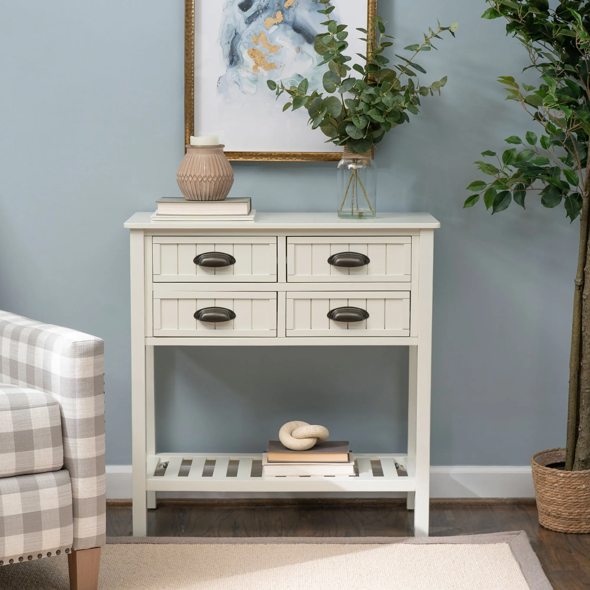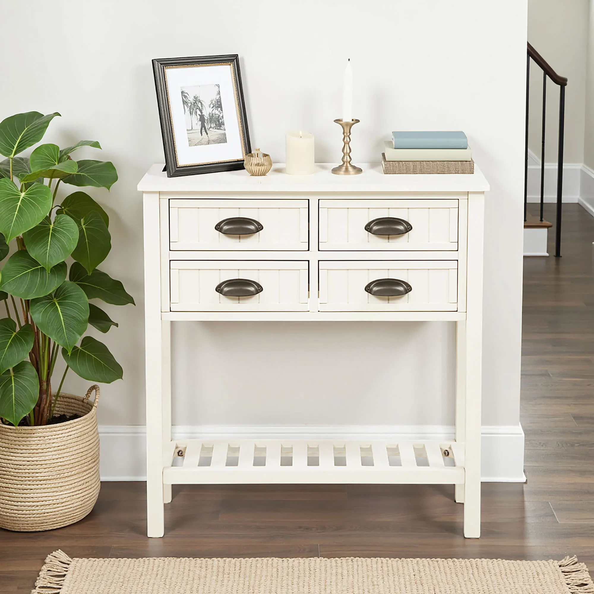Charming details style the Baxley White Console Table and its ample storage space with an inviting air. With a wide smooth top, the wooden side table features simplistic lines, a lower slatted display shelf, and four drawers to store your items. Each drawer measures 10.5"Wx8.5"Dx4.5"H, has a warm bronze metal cup-style pull, and delights with a beadboard-inspired carved paneling front. The white finish is painted. The lower shelf measures 30"Wx12"Dx13.5"H overall. Maximum recommended storage weight is 75 lbs. Overall, the rectangular storage table measures 31"Wx13.5"Dx32.5"H and weighs approx. 35 lbs.