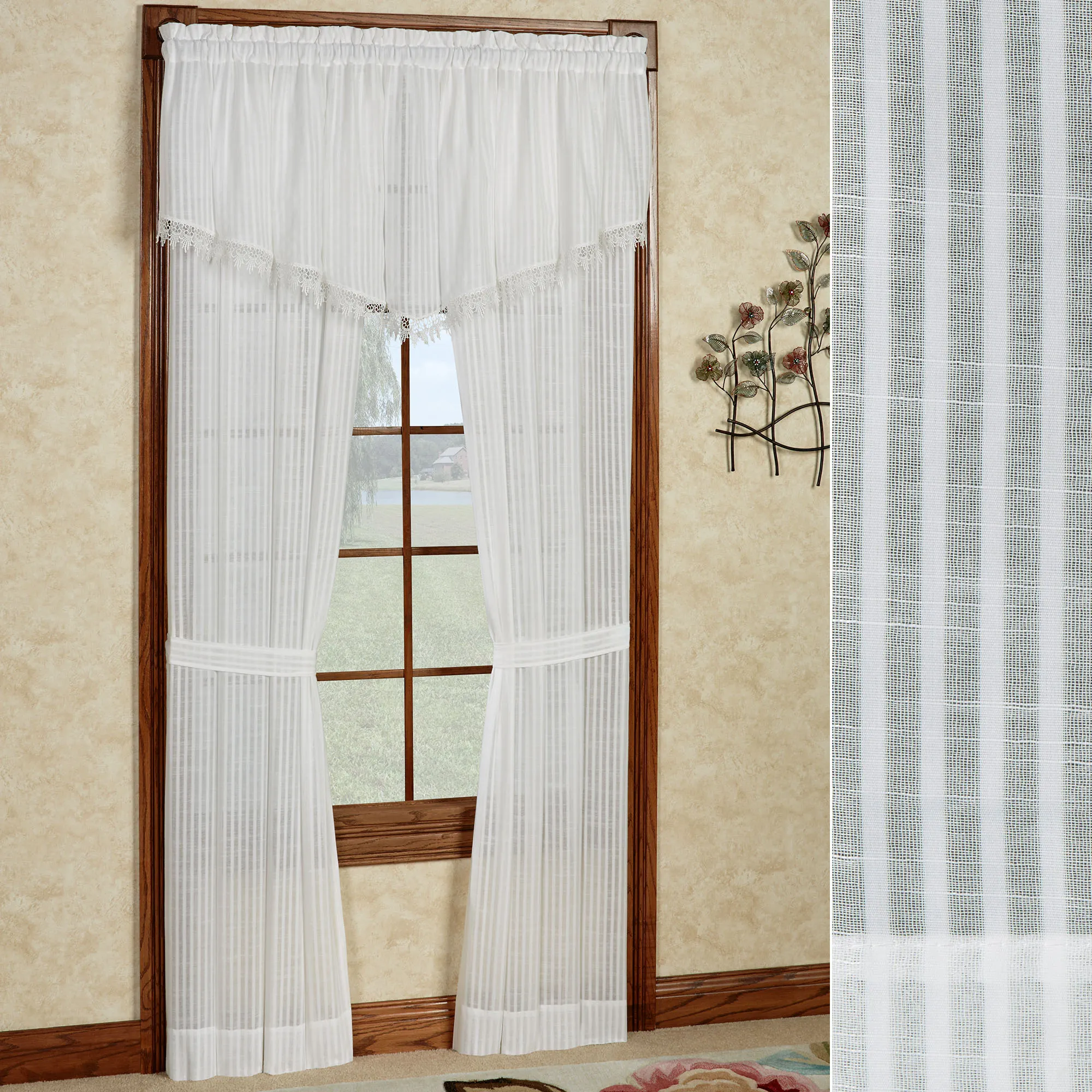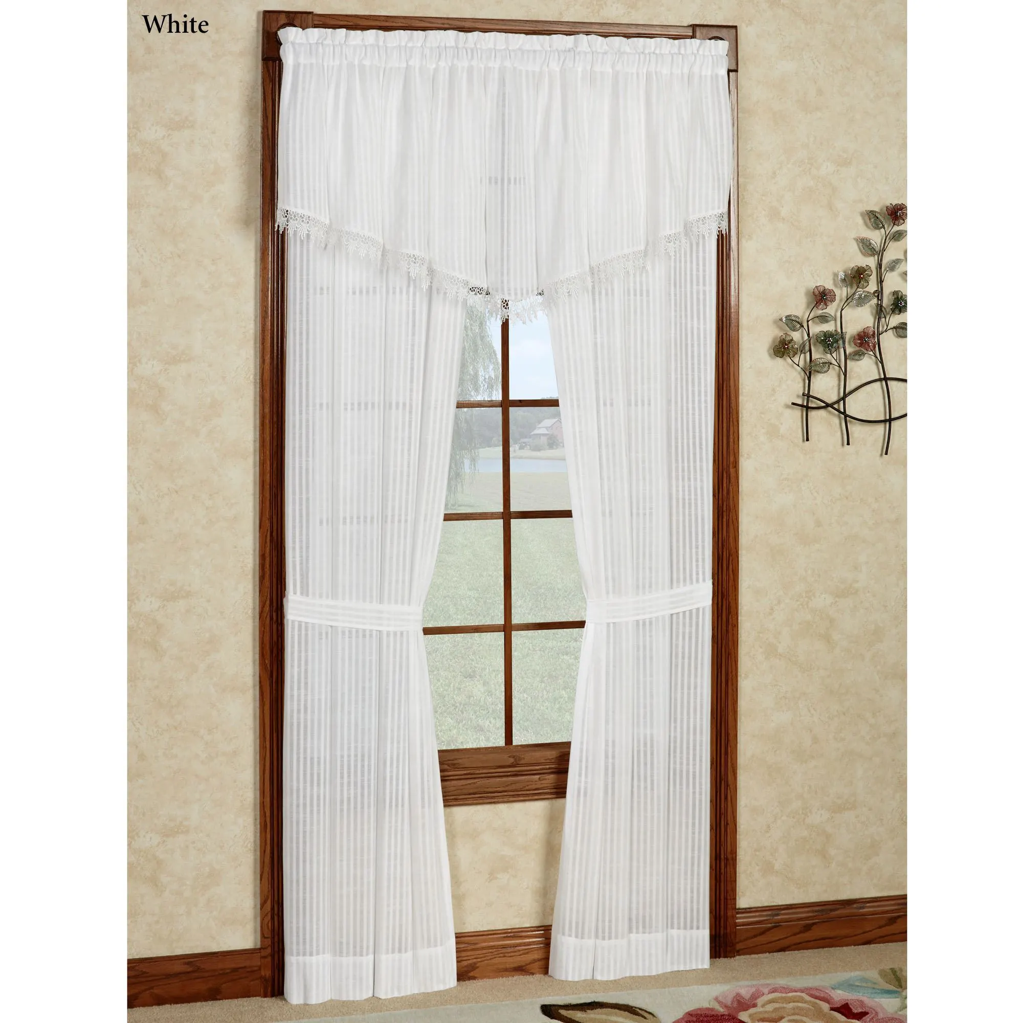 Let the Bay Breeze blow in these classy stripes. This semi-sheer polyester window treatment features alternating sheer and opaque stripes with a textured linen look. Specify Curtain Pair or Shaped Valance. Curtain Pair, 72"W, includes tiebacks. Shaped Valance, 72"Wx25"L, has embroidered lace on the bottom edge. Rod pocket size is 2". Washable. Imported. The curtain pair width is the total width of two panels together.