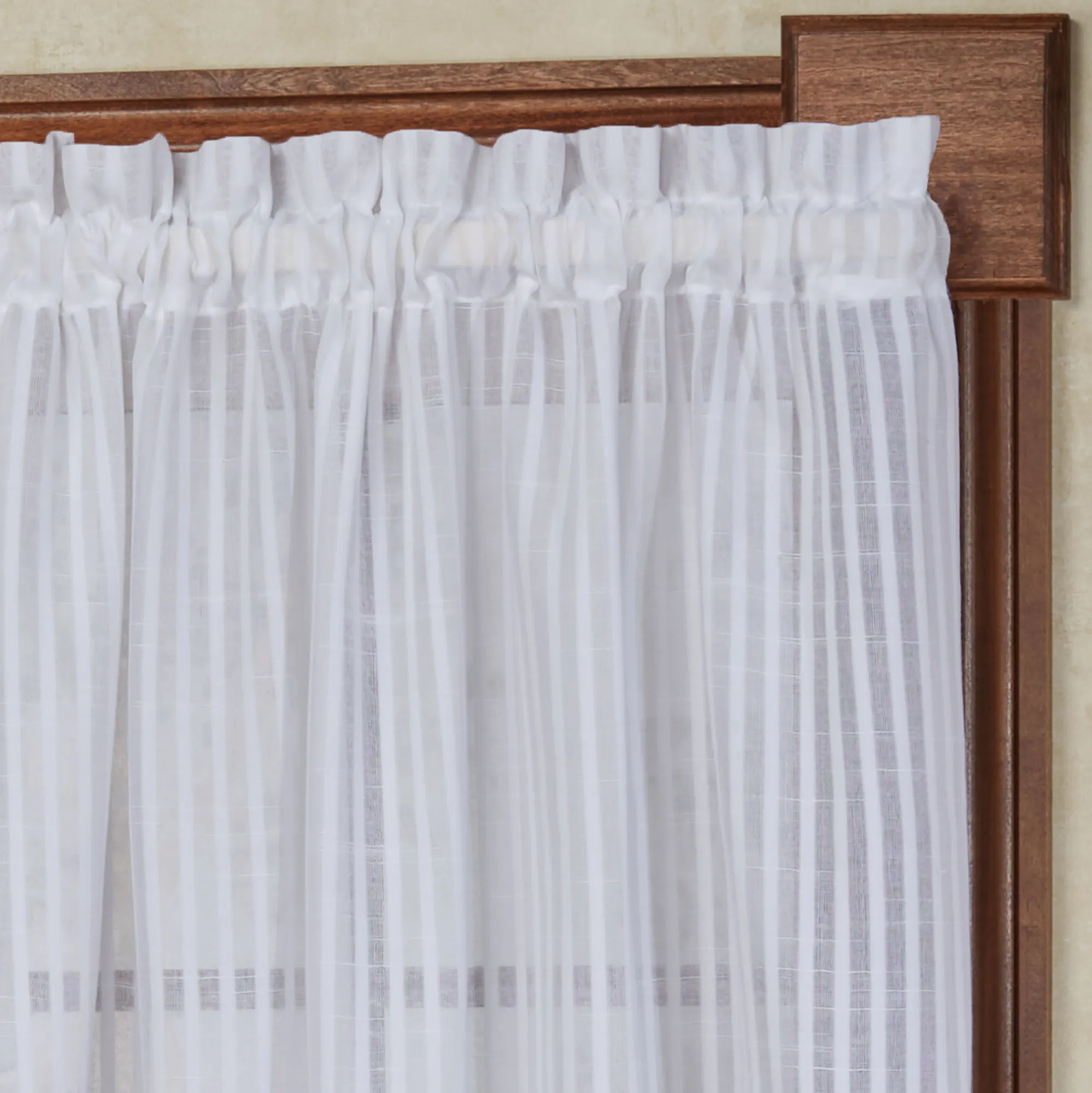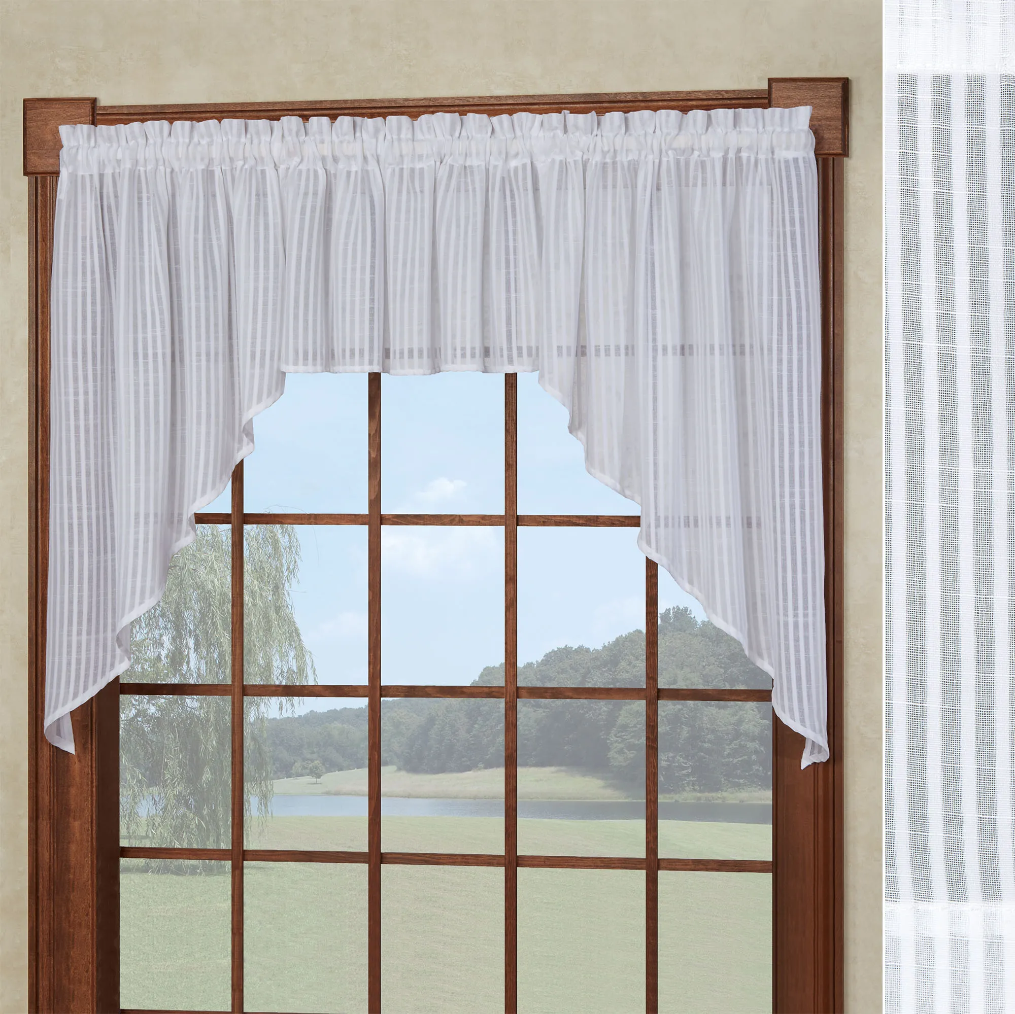 Let the Bay Breeze blow in these classy stripes. This semi-sheer polyester window treatment features alternating sheer and opaque stripes with a textured linen look. The three-piece Swag Valance Set includes an insert valance, 36"Wx14"L; and a swag pair, 72"Wx38"L. Overall, the set measures 108"Wx38"L. Rod pocket size is 2". Washable. Imported.