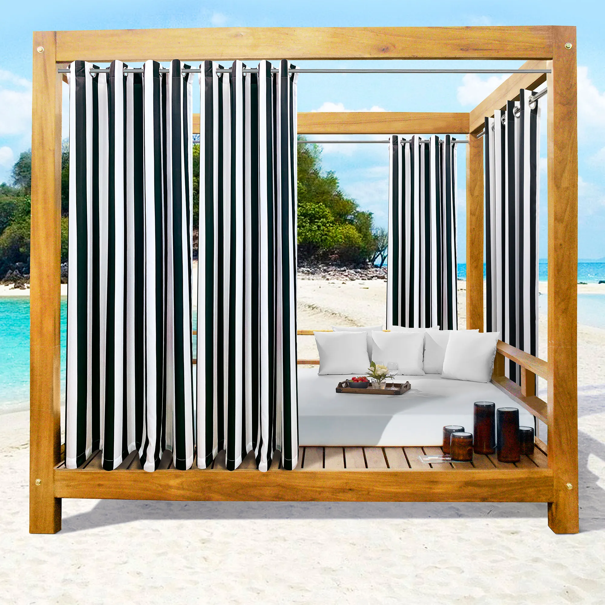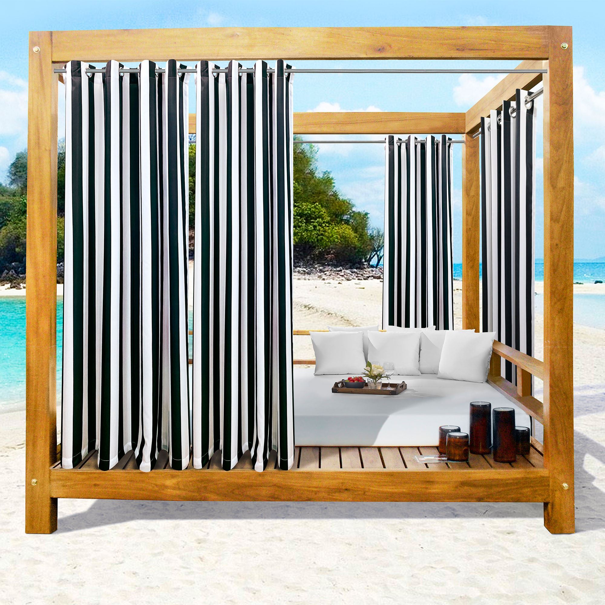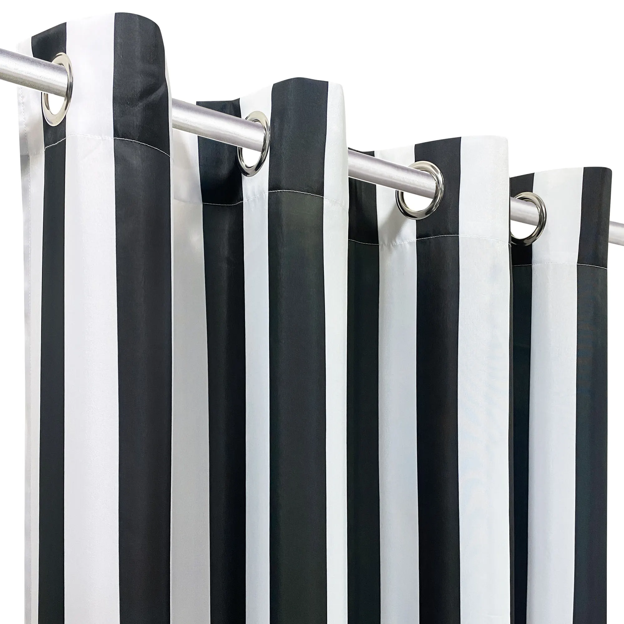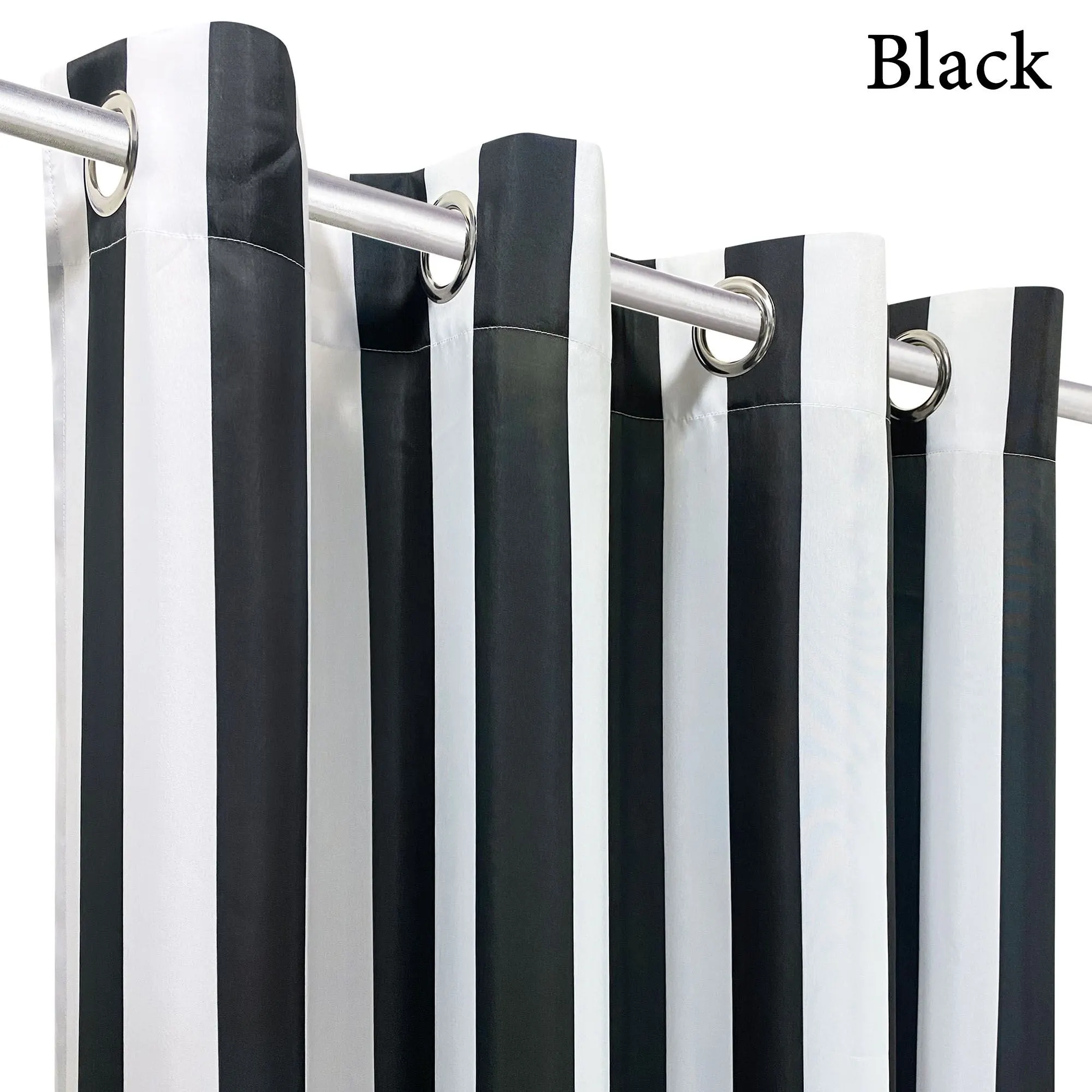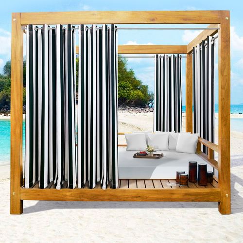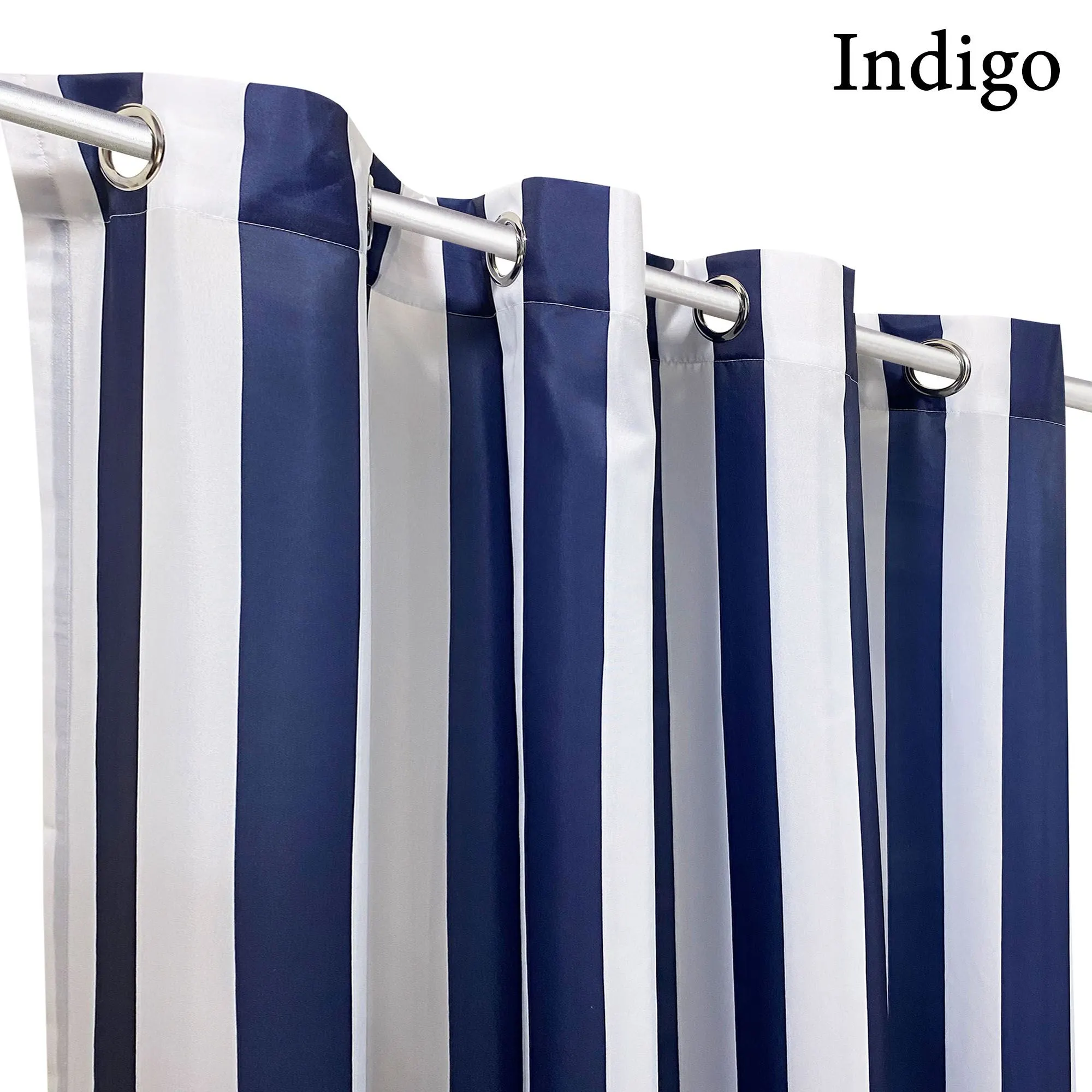 Perfect for pergolas, gazebos, balconies, or decks, the Bayport Stripe Curtains add privacy to any outdoor sanctuary. Semi-sheer polyester curtains are water-repellent and UV-, fade-, and mildew-resistant. Curtains have weighted corners and UPF 50+ protection. Rustproof metal grommets, 1.5" dia., have a silver finish. May be used indoors or outdoors seasonally. Wide curtains are sold as a pair; curtain pair is 100"W. Machine washable. Imported. The curtain pair width is the total width of two panels together.