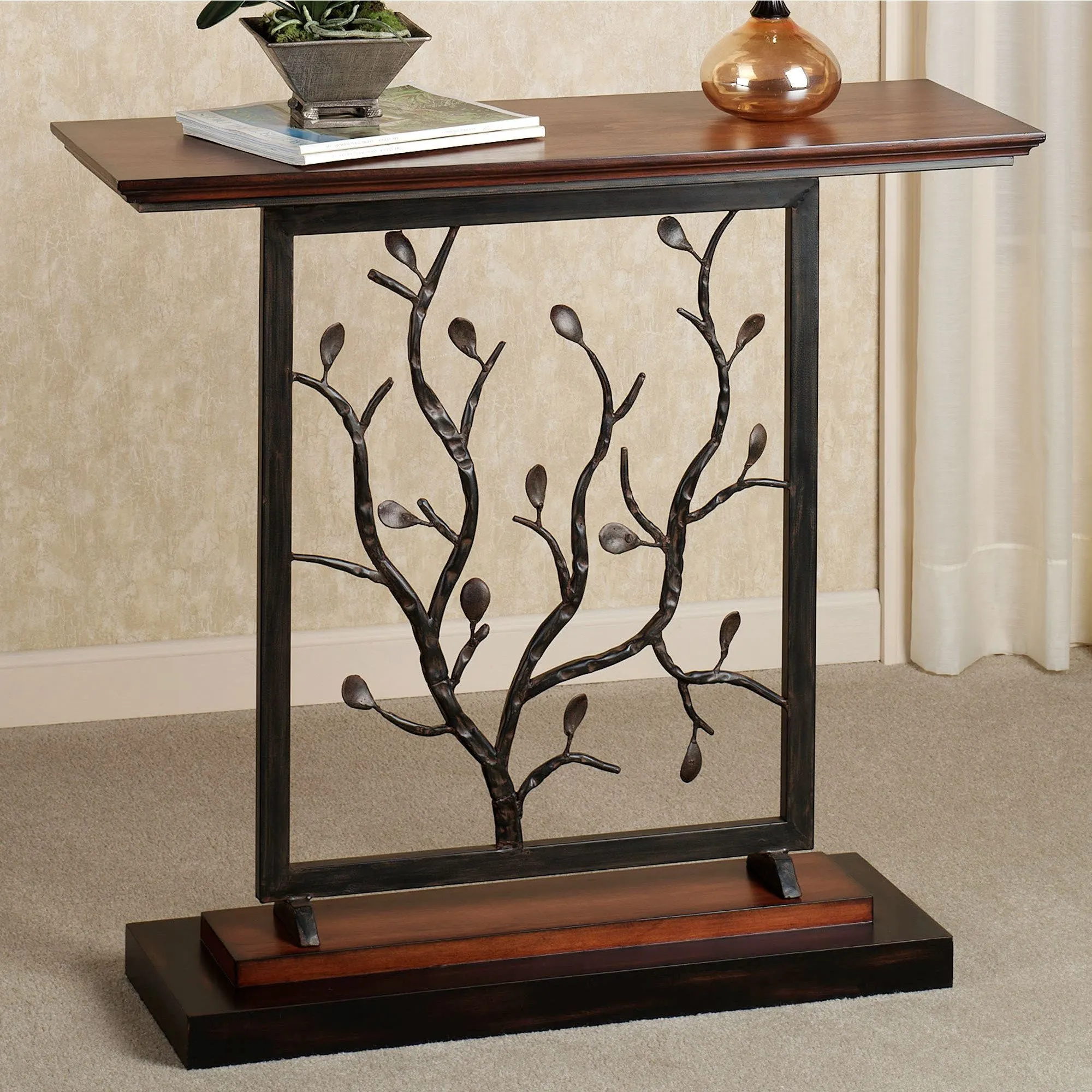 A unique and stunning accent, the Baytree Sofa Table has a design that is far too beautiful to hide. Sporting a black metal frame with a distressed finish, the leafy branches give this sofa table its one-of-a-kind look. Wooden top and base are veneered in natural cherry. Measures 36"Wx12"Dx33"H; weighs 23 lbs.