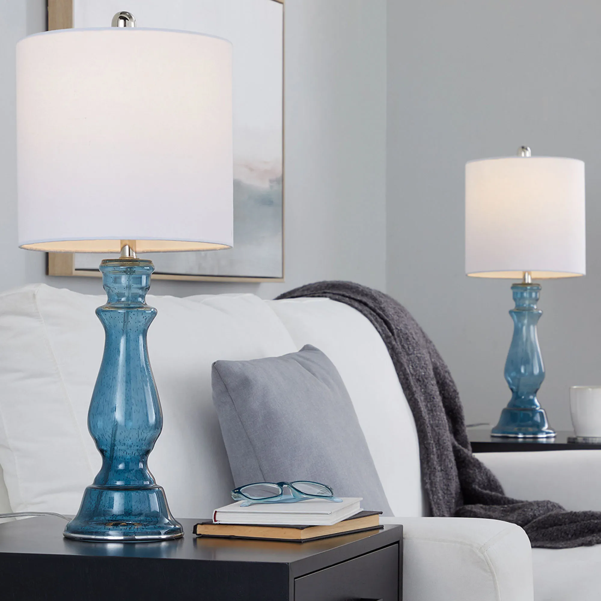 The classic style of the Bea Table Lamp Pair decorates with undeniable charm. Made of seeded glass, these lamps have an ombre effect with dark blue at the bottom that fades to light blue at the top, along with polished nickel metal accents. Linen fabric shades are off-white. UL listed. Each requires one 60W max. bulb and measures 10"dia.x24.5"H.