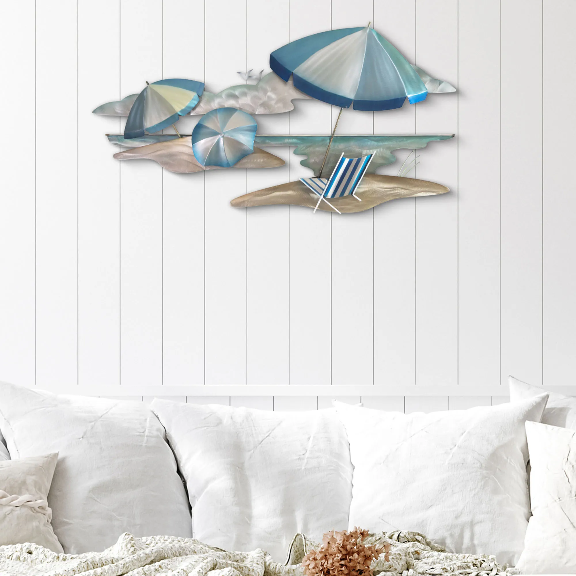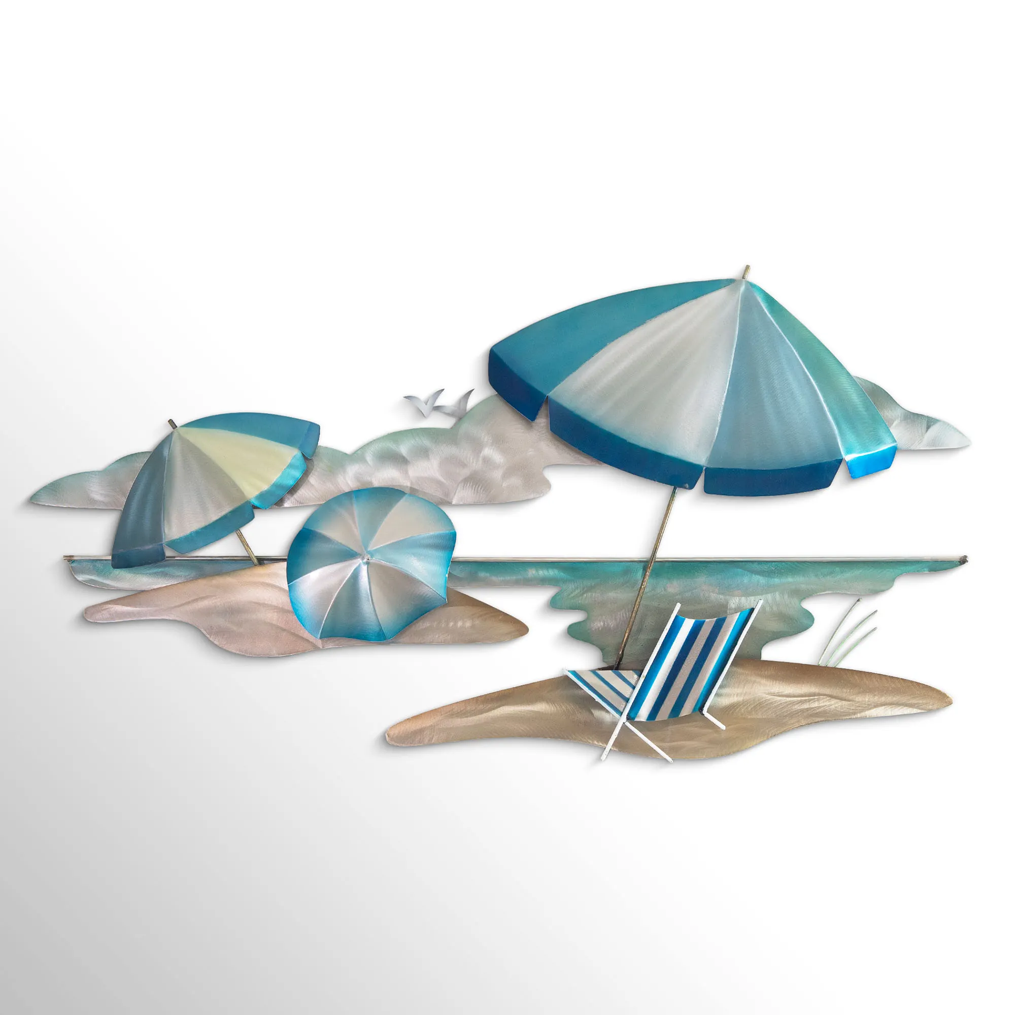 Whisk yourself away to the Beach Life with this wall sculpture designed by artist Joanne Ferrara. Handcrafted of metal and stainless steel, striped umbrellas and a beach chair await you on the sand as silver seagulls fly over the clouds and pristine waters. Hand-dyed blue, aqua, and light brown shades add natural hues, while the hand-grinded details add unique textures. Perfect for your indoor space, covered porch, or enclosed patio, the beach wall art measures 31"Wx3"Dx16"H.