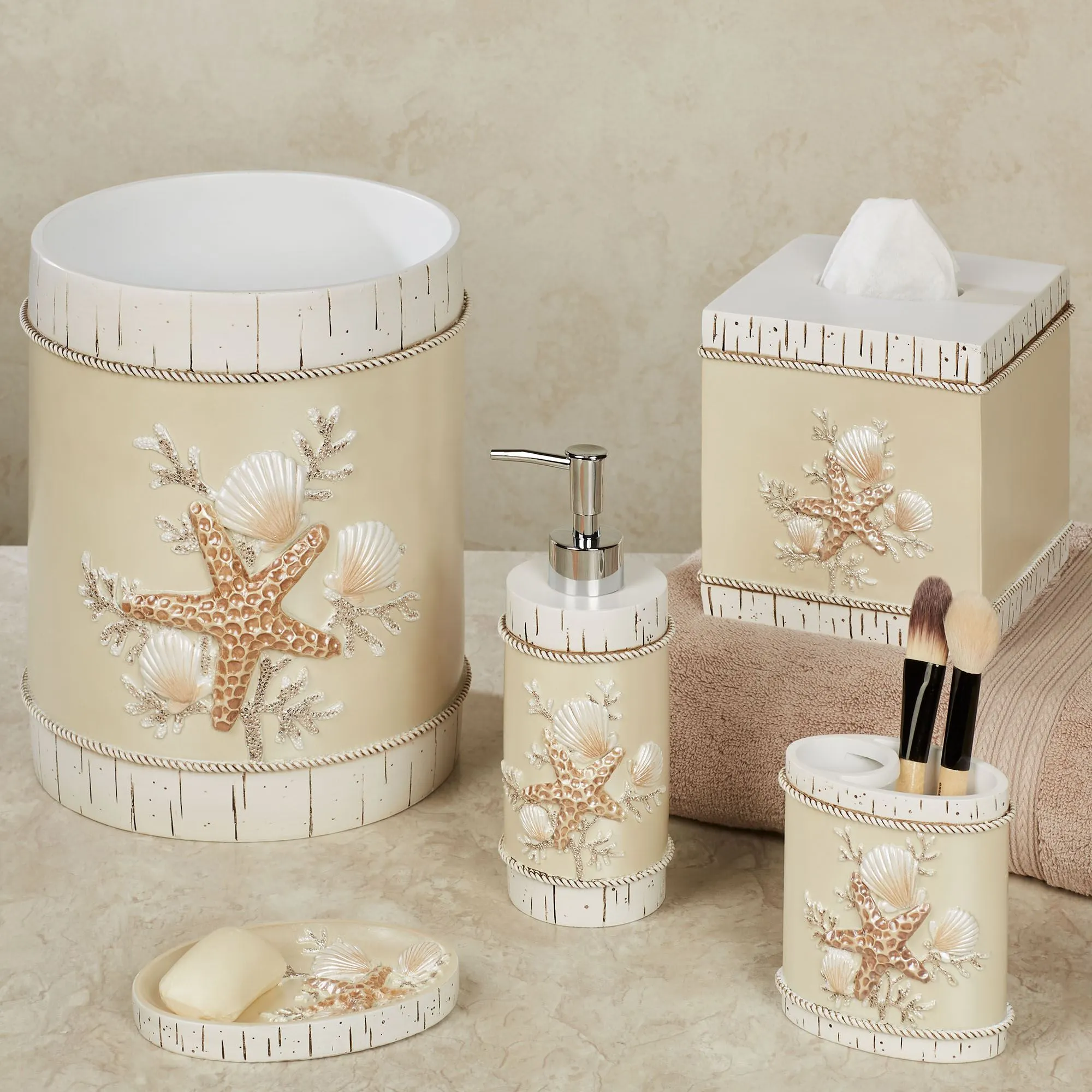 If the ocean is calling and you cannot go, you can still enjoy the coastal treasures upon the Beach Time Bath Accessories. Made of resin, these bath accents have handpainted, raised starfish, coral, and seashells on a warm pearl background, ivory twist trim, and an ivory wood look. The Brush Holder can hold toothbrushes or makeup brushes. Specify Tissue Cover or Soap Dish.