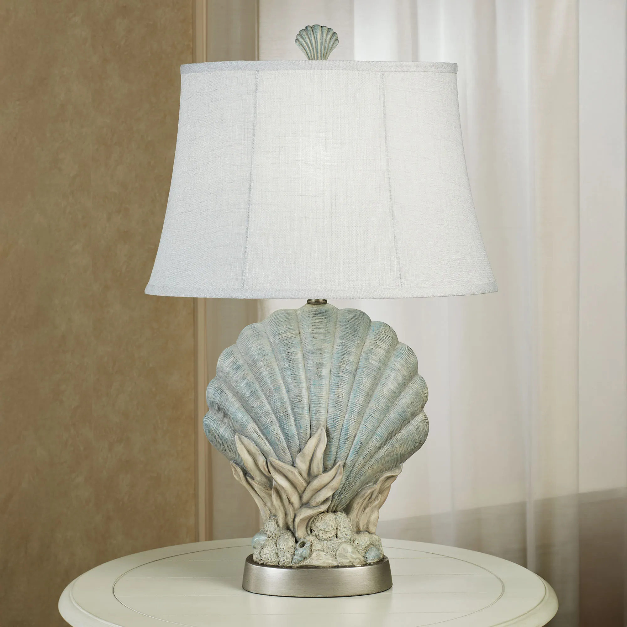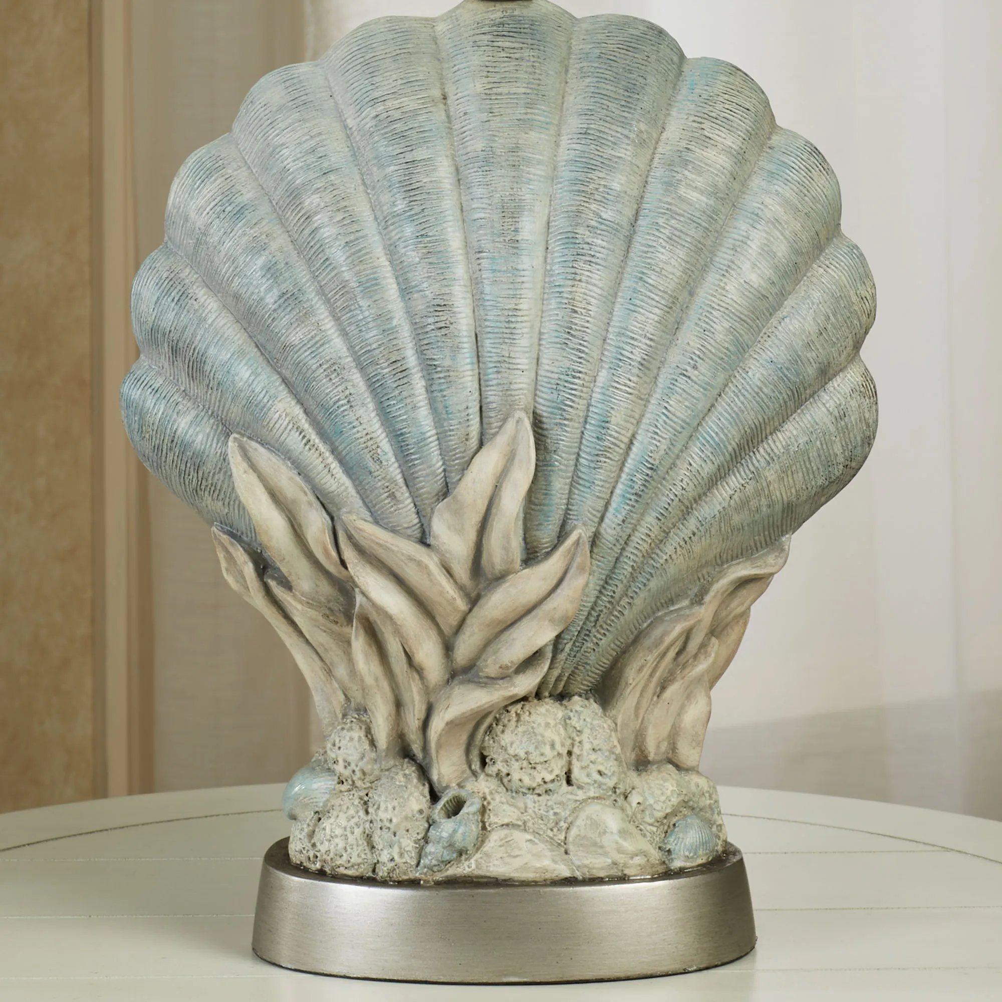 Beach Treasure makes a coastal home complete. With realistic texture and detailing, the resin table lamp design features a round champagne silver base and a large, distressed pale blue scallop shell font surrounded by light taupe seagrasses, ivory coral, and shells. An eggshell silk-blend oval empire shade tops the coastal lamp beneath the matching 3.25"H shell finial. UL listed. Requires one 3-way 150W max. bulb. Overall, the shell table lamp measures 18.5"Wx13.5"Dx29.5"H.
