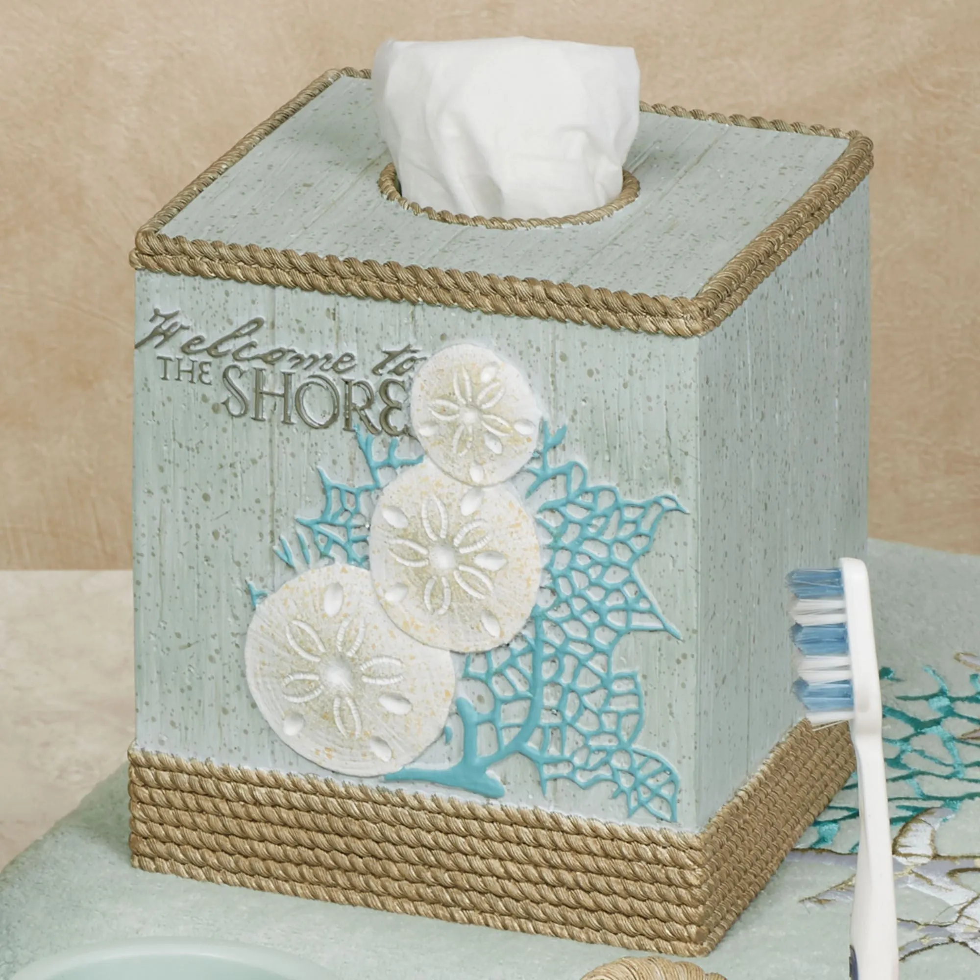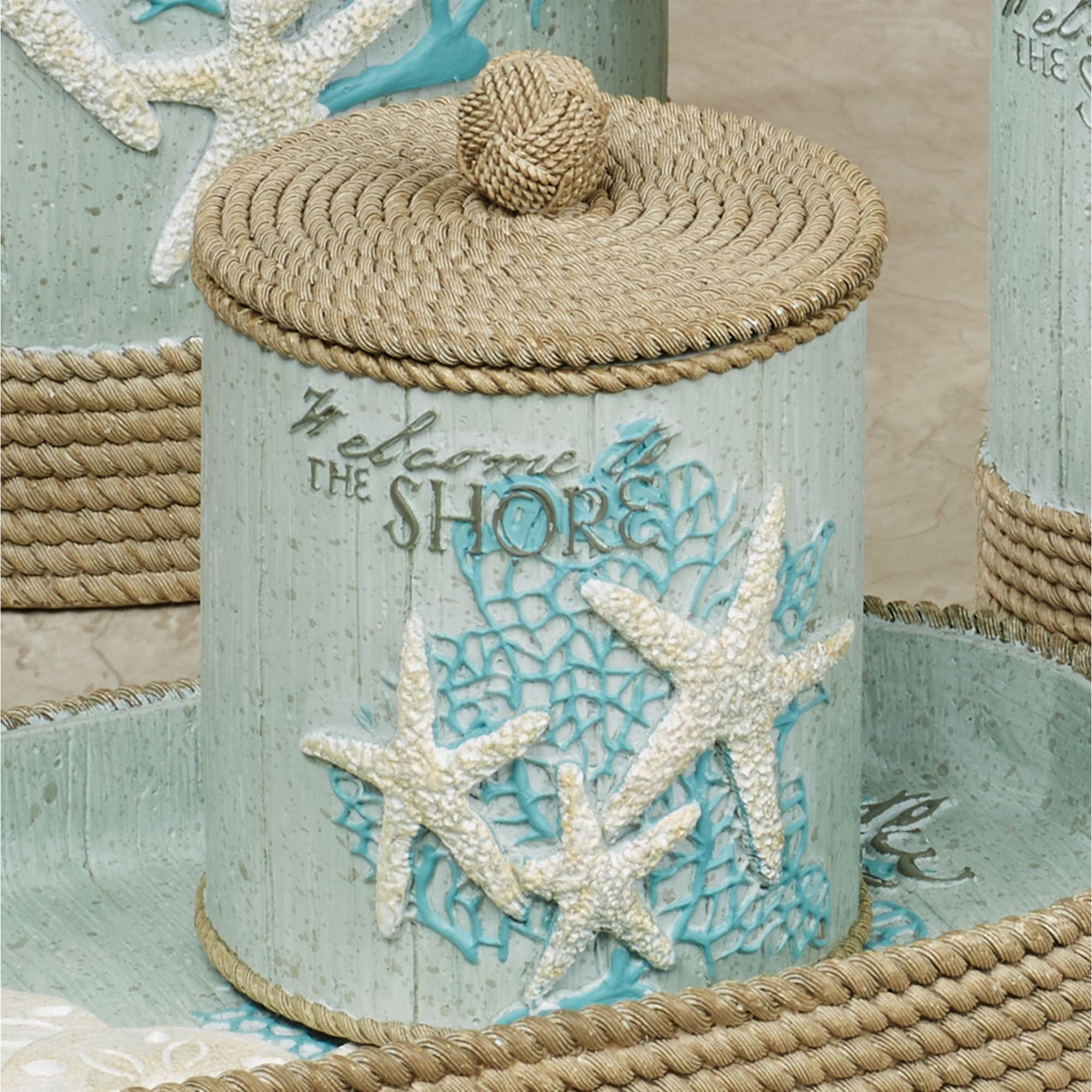 Discover a few of nature's great treasures on the Beachcomber Coastal Bath Accessories. Made of resin, most of these accessories have a wood-like background with various designs, including dimensional starfish, sand dollars, coral, the words "Welcome to the Shore," and faux rope trim. Brush holder is faux rope with starfish accents and will hold toothbrushes or makeup brushes. Colors include celadon, white, dark gold, and turquoise. Choose Wastebasket, Tissue Cover, Lotion/Soap Dispenser, Tray, Covered Jar, Brush Holder, Tumbler, or Soap Dish.