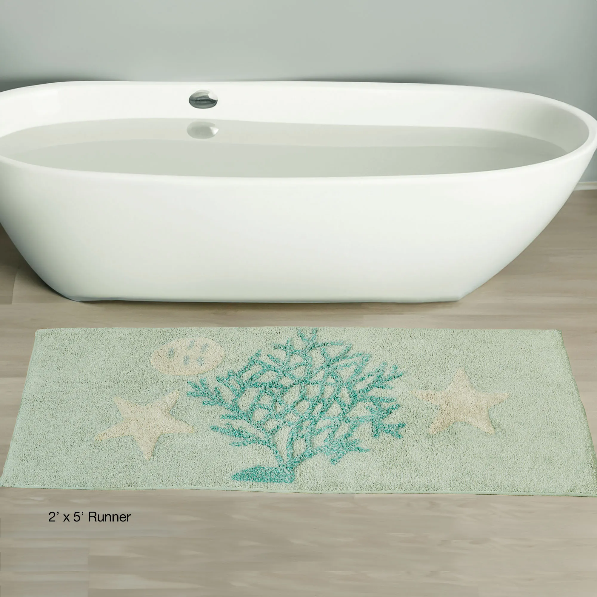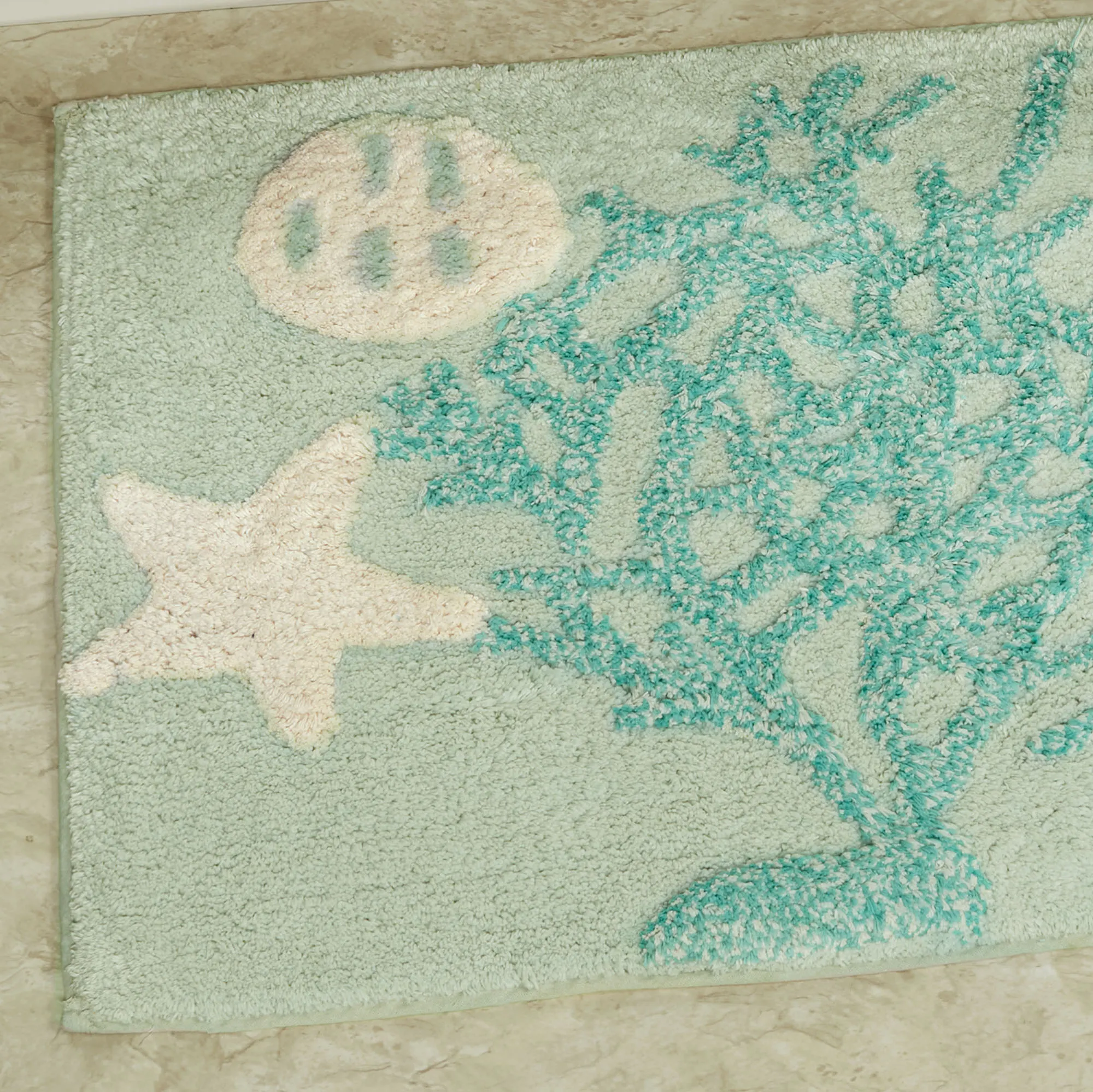Discover some of nature's treasures on the Beachcomber Coastal Bath Rug. In a tufted, soft cotton design, the .5" thick rug features a celadon ground with mingled natural and turquoise coral, natural starfish, and a sand dollar. Backing is nonskid spray latex. Machine washable. Imported.
