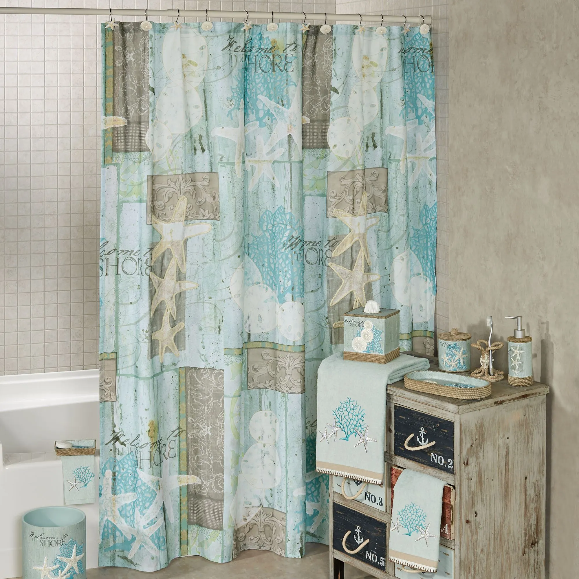 Discover a few of nature's great treasures on the Beachcomber Coastal Shower Accessories. The polyester Shower Curtain features printed sea life, scrolling motifs, the words "Welcome to the Shore," and twist corded accents. Colors include shades of light brown, ivory, white, pastel blue, aqua, jade, celadon, and lime green. Shower curtain measures 72"Wx72"L and is machine washable; imported. Shower Hooks are sold separately in a 12-piece set. The resin and metal shower curtain hooks are shaped like sand dollars and starfish. Each hook is 2"Wx2"Dx3"H.