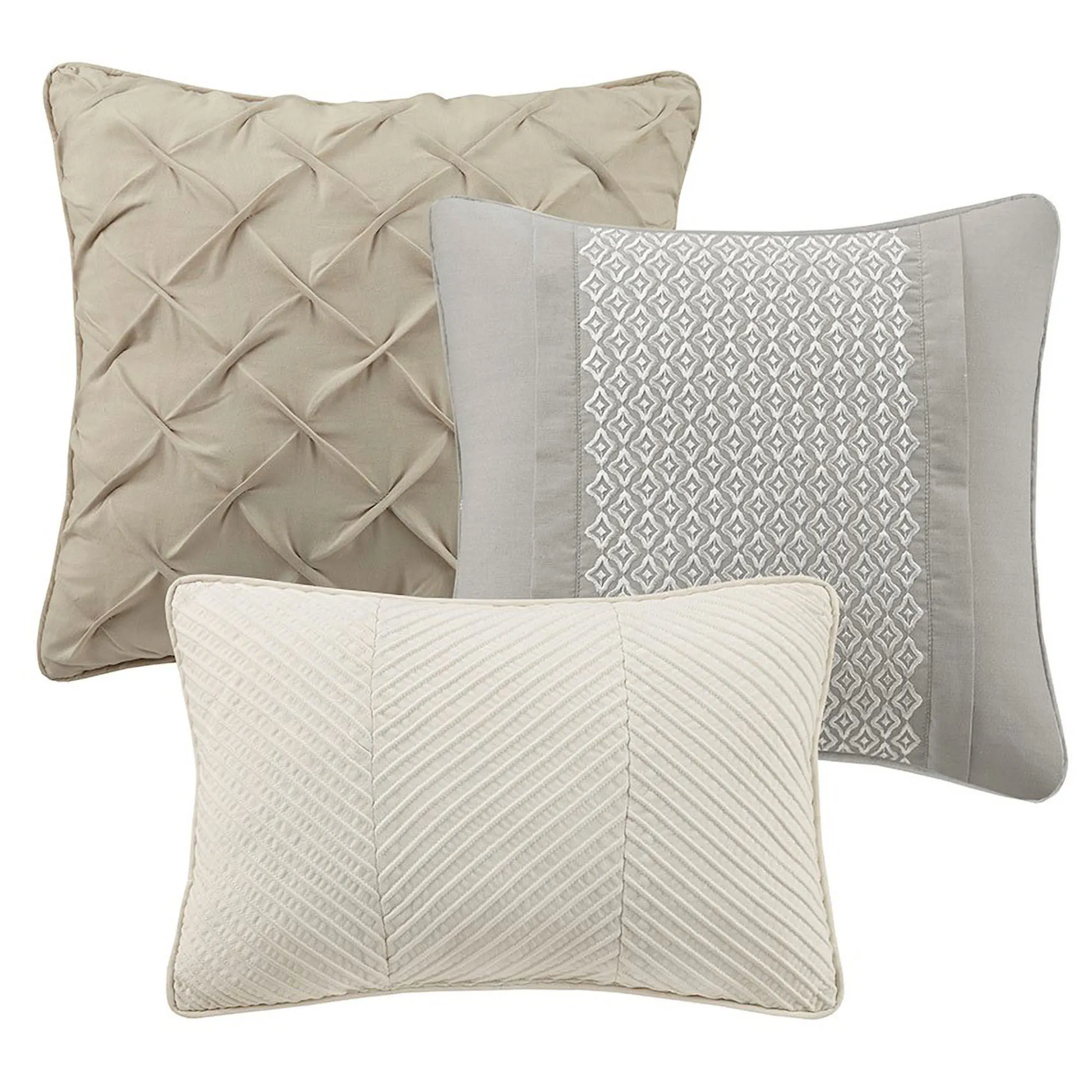 Pillows (included in bed set): Beige square, 18". Gray square, 16". Rectangle, 12"x18".