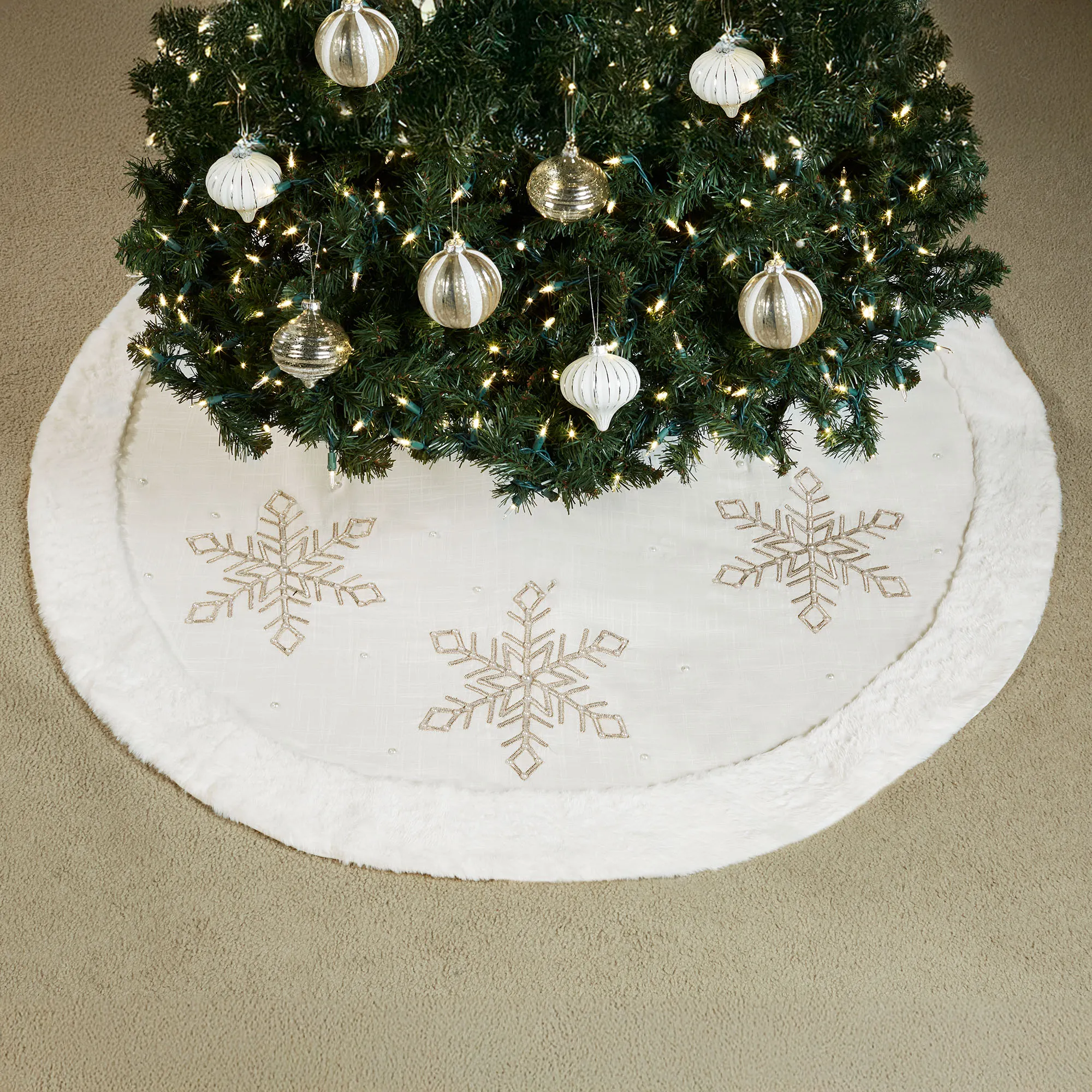Winter beauty shines from within Beaded Snowflake motifs. Crafted from faux pearl beads and embroidery in metallic silver and champagne bronze, three lovely snowflake silhouettes adorn the off-white polyester tree skirt. More faux pearls and faux fur trim complete the beautiful winter design; tie closure. Overall, the Christmas tree skirt measures 54" dia. Spot clean only. Imported.