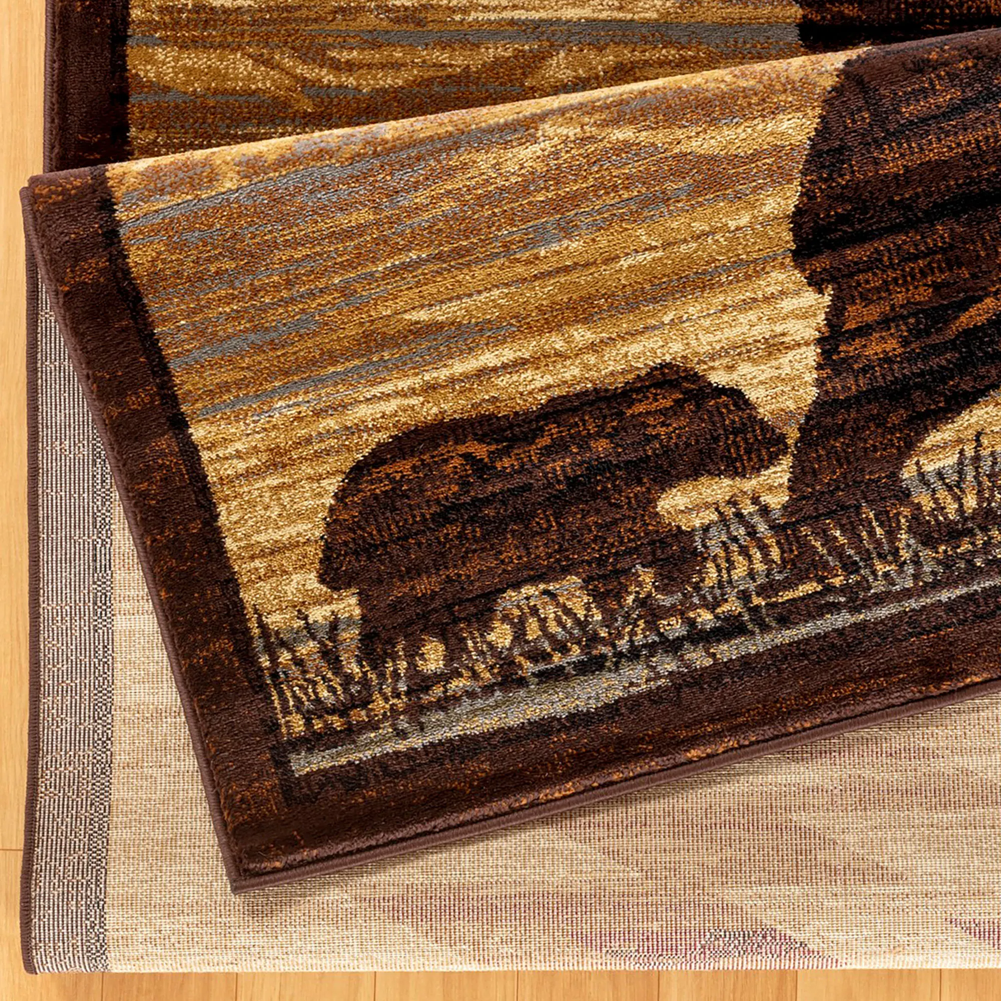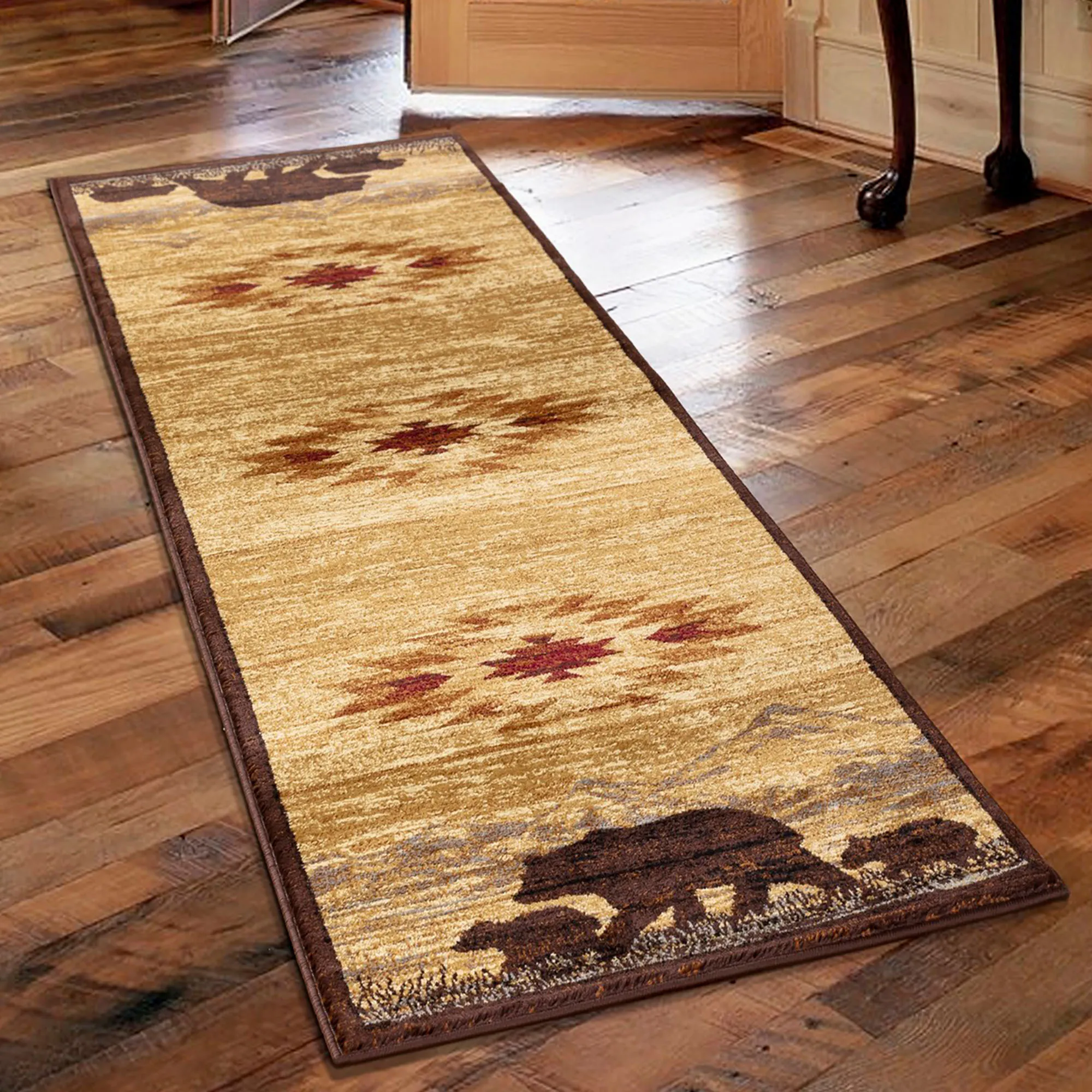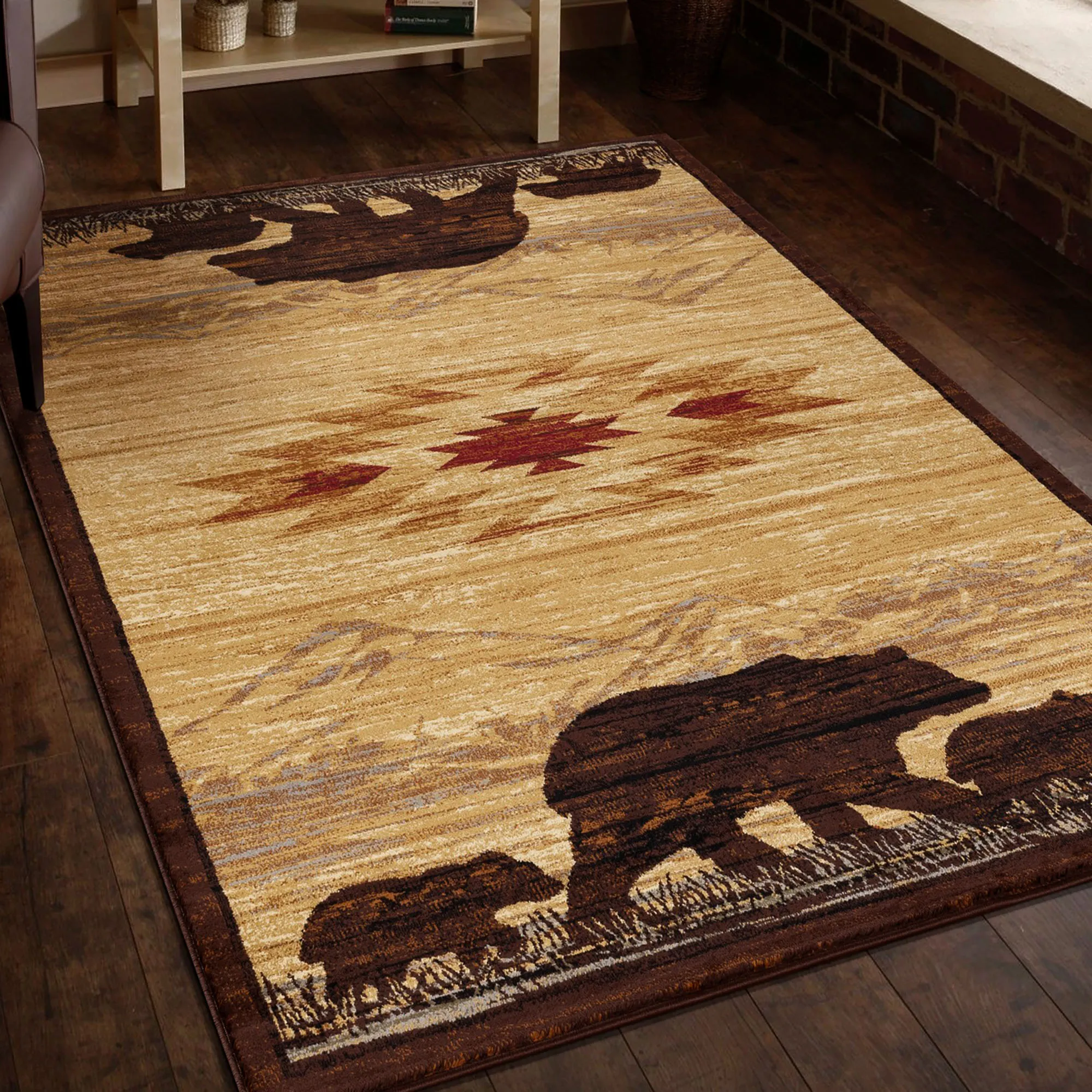 Bear Cubs learn the wild, rugged terrain from their mother bear. Power-loomed from polypropylene, the .39" thick rug features a mama bear and two cubs walking along each rug end. The striated background has a mountain range and center Southwestern geometric design, all in shades of beige, cream, brick red, gold, brown, black, blue gray, and tan. Backing is jute. We recommend professional cleaning by a rug cleaner. Imported.