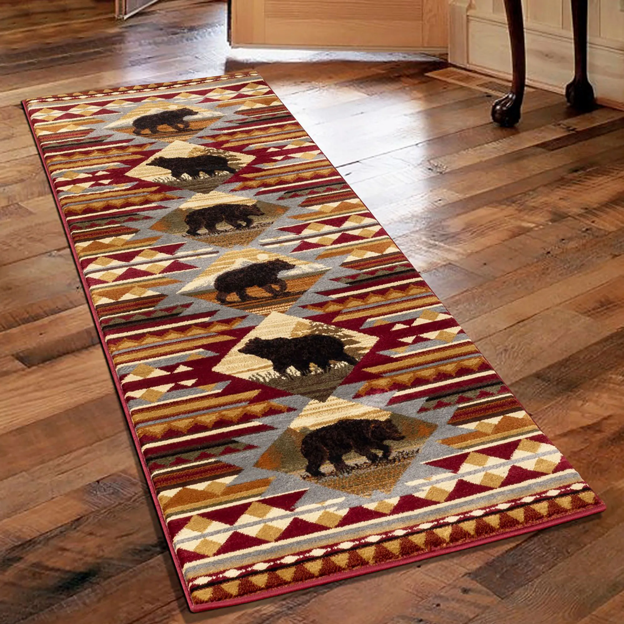 Southwest and rustic styles converge in the beautiful Bear Lodge Rug. Power-loomed from polypropylene, the .39" thick rug features bears inside scenic diamonds surrounded by classic Southwestern-inspired diamonds, triangles, and stripes. Bold shades of wine, black, beige, gold, brown, blue gray, and cream color the design. Backing is jute. We recommend professional cleaning by a rug cleaner. Imported.