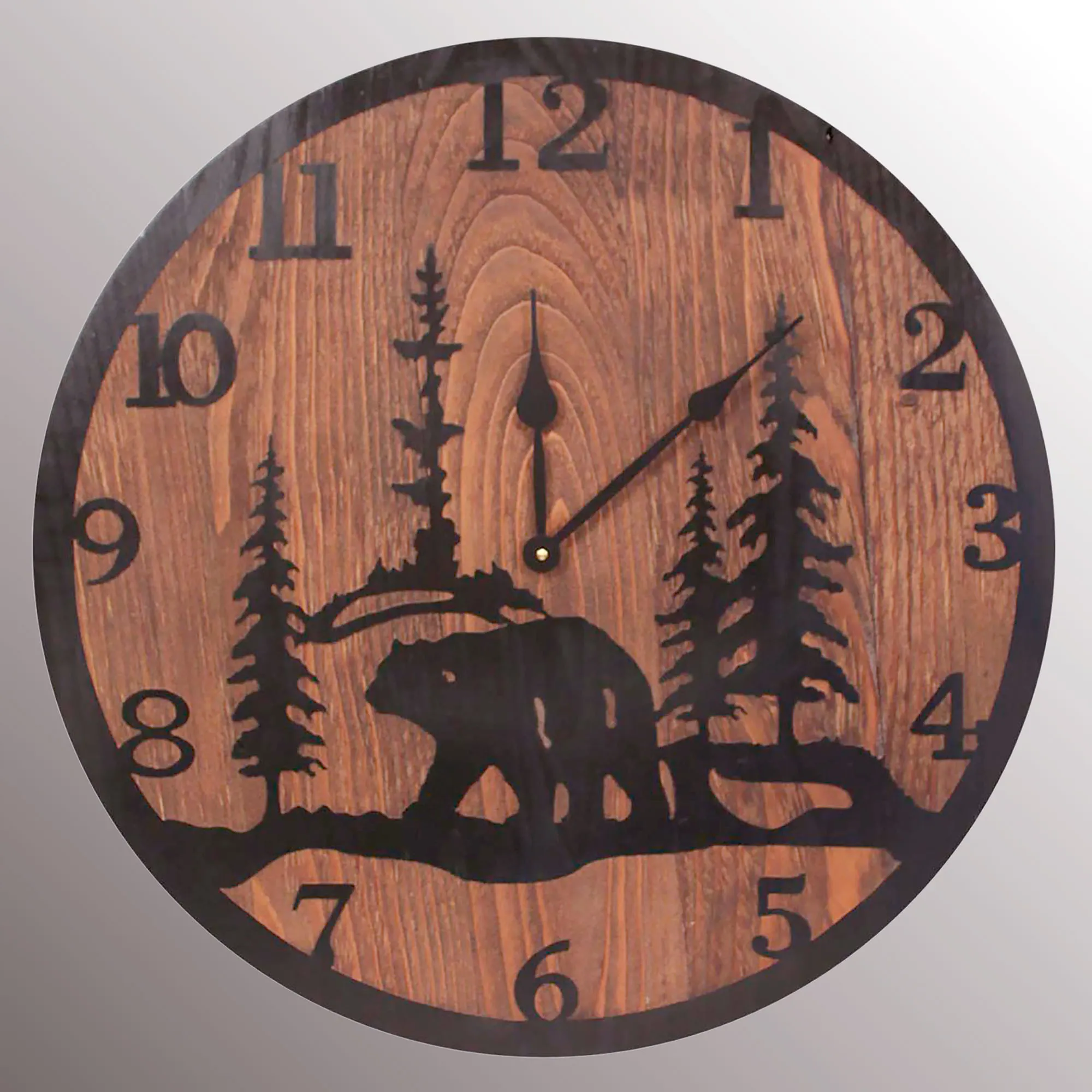 Taking a solo journey, this bear walks alone in the rustic wilderness. This handcrafted wood wall clock has black etched numbers, a Bear Scene, and a border on a stained, dark brown background. Clock hands are black metal. This woodland-inspired bear wall clock is made in the USA and measures 24"dia.x4"D; weighs 10 lbs.