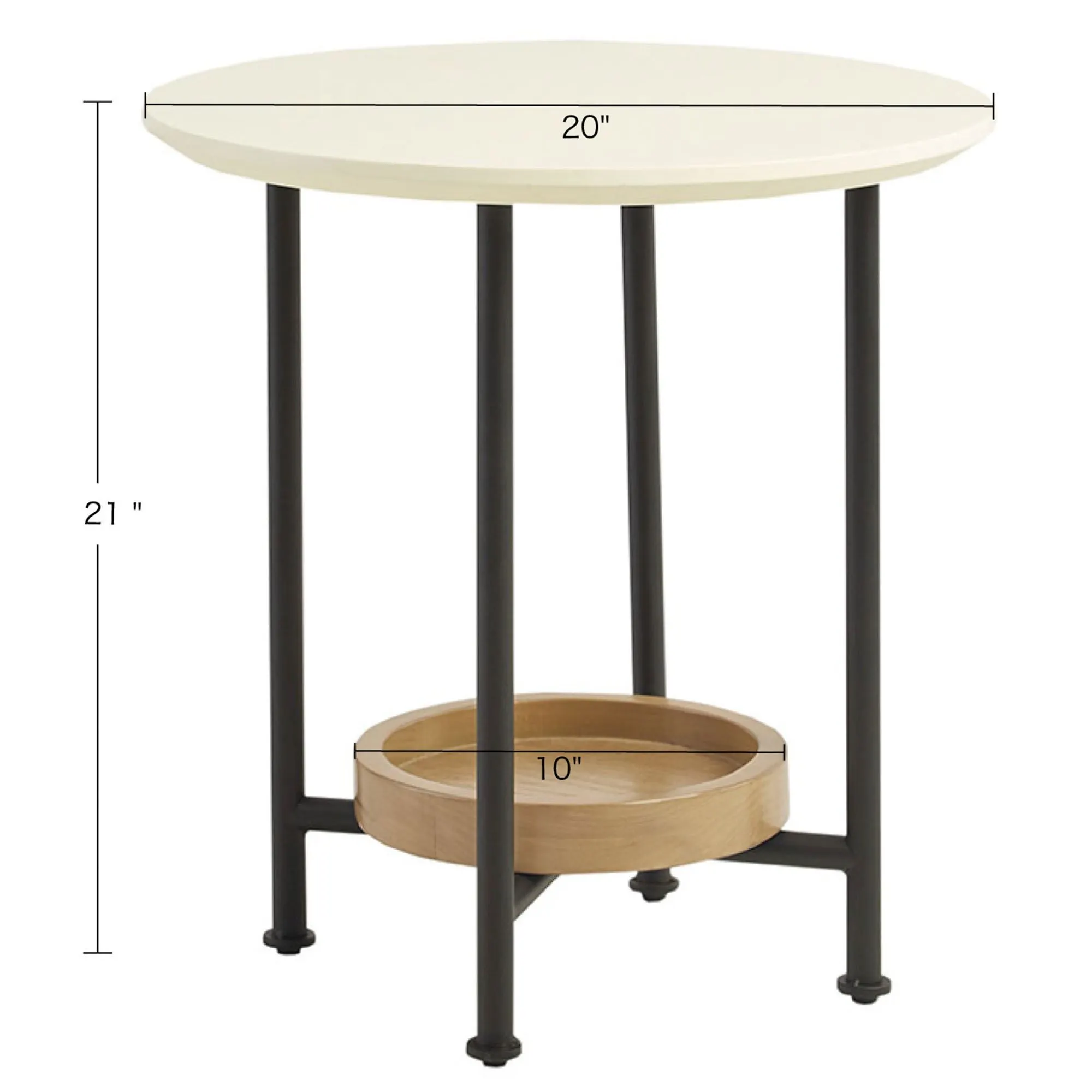 Smooth style refines the Beau Round Side Table. With a circular shape, a white wooden surface provides a beautiful table top upon the black metal framework. A natural finish adds an organic touch to the tray-style wood bottom shelf; measures 10"dia.x2"H. Overall, the accent table measures 20"dia.x21"H and weighs approx. 15 lbs.