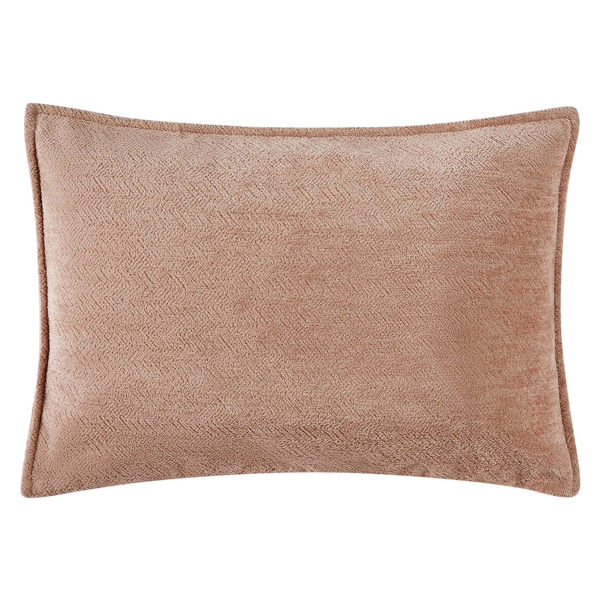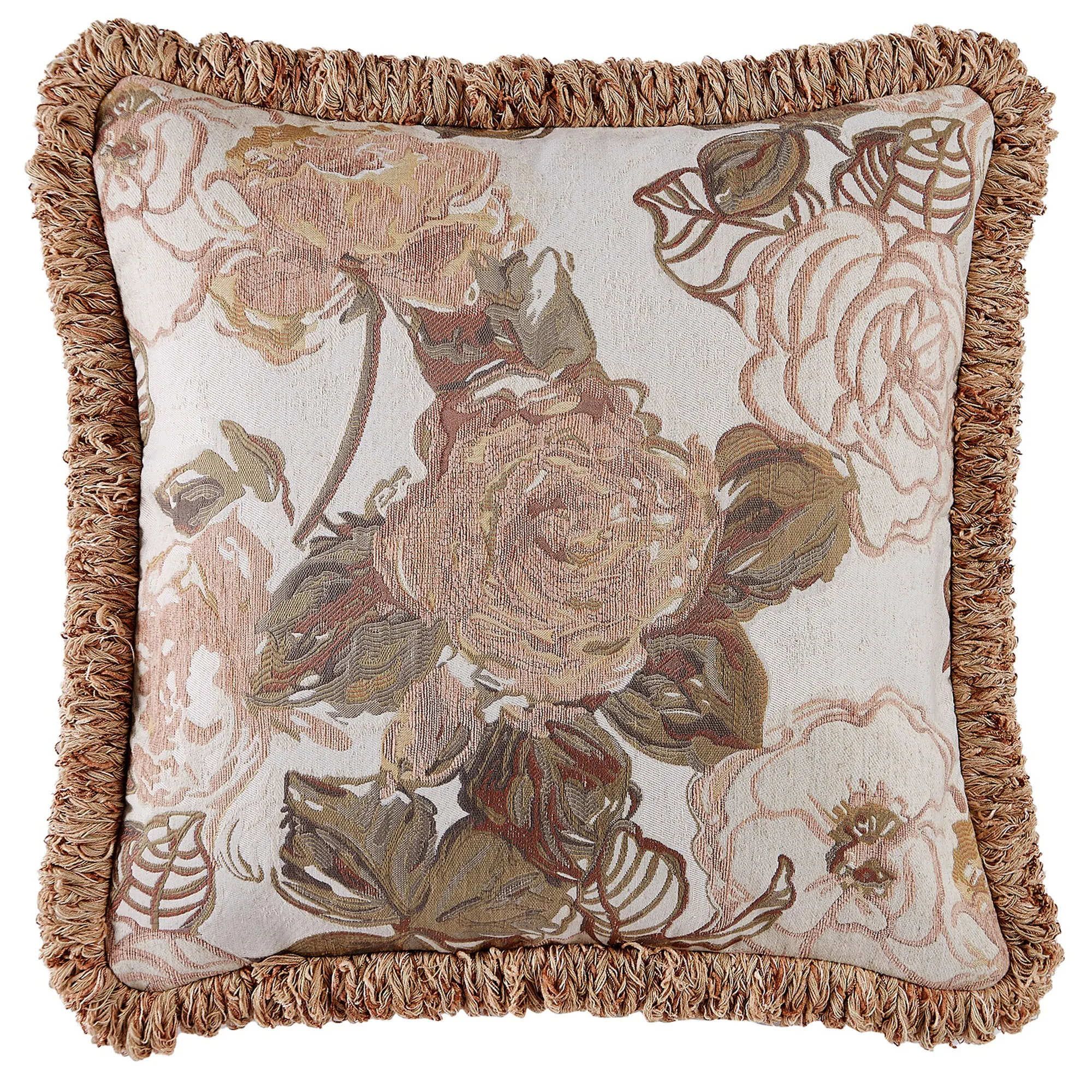 Pillows: Spot clean. Fringed Square has roses. The reversible Piped Square is slubbed linen. The reversible, piped Rectangle is rose-colored chenille.